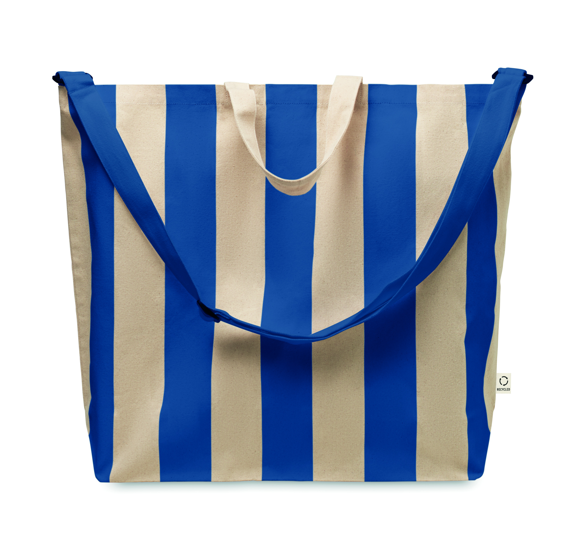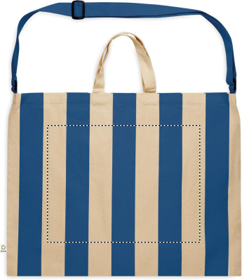 Erittäin suuri raidallinen rantalaukku 280 g/m² kierrätettyä puuvillaa (80%) ja kierrätettyä polyesteriä (20%), sisätasku. Lyhyet kahvat ja yksi iso säädettävä olkahihna.