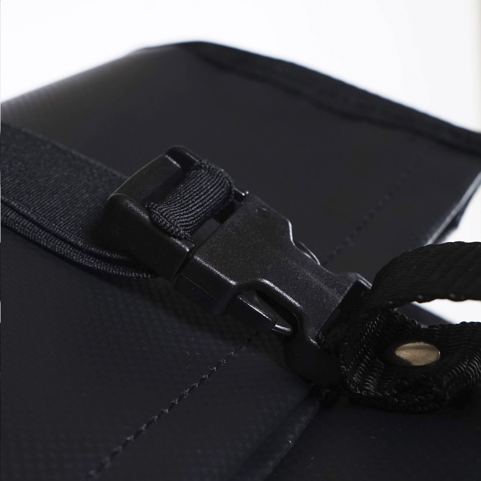 Fraenck-merkin polkupyörälaukku, valmistettu kierrätetystä purjekankaasta. Tukeva ja vettä hylkivä materiaali tulee purjeenvalmistusteollisuuden kierrätetyistä jäännösmateriaaleista. Rullasuljin voidaan rullata ylös ja kiinnittää sulkuklipsiin. Laukun molemmat puolet on vahvistettu esiteipillä. Sisäpuolella on vahvistettu pohja ja takaosa. Helppo kiinnittää polkupyörätelineeseen. Valmistettu Hollannissa.