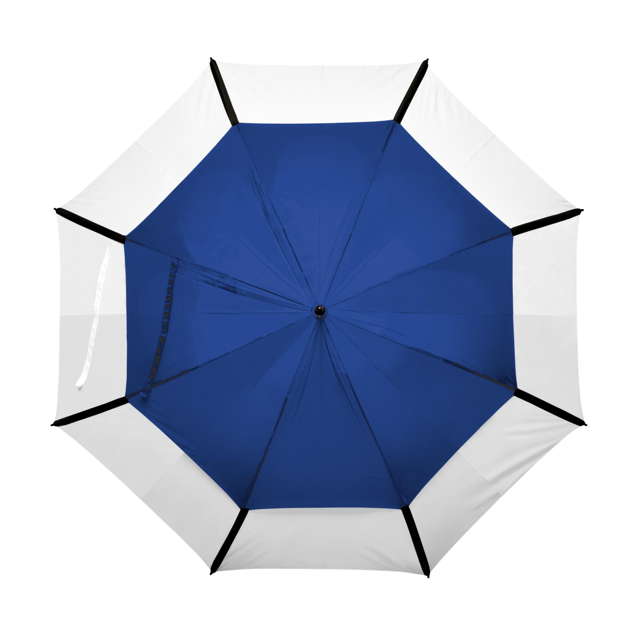 Ylellinen kaksikerroksinen golfsateenvarjo, jossa 190T polyesteri ja 190T nylon katos, myrskytoiminto, tuulensuojajärjestelmä, lasikuiturunko ja -kahva, pehmustettu pehmeä vaahtomuovikahva ja kaksinkertainen tarranauhakiinnitys. Pussissa.