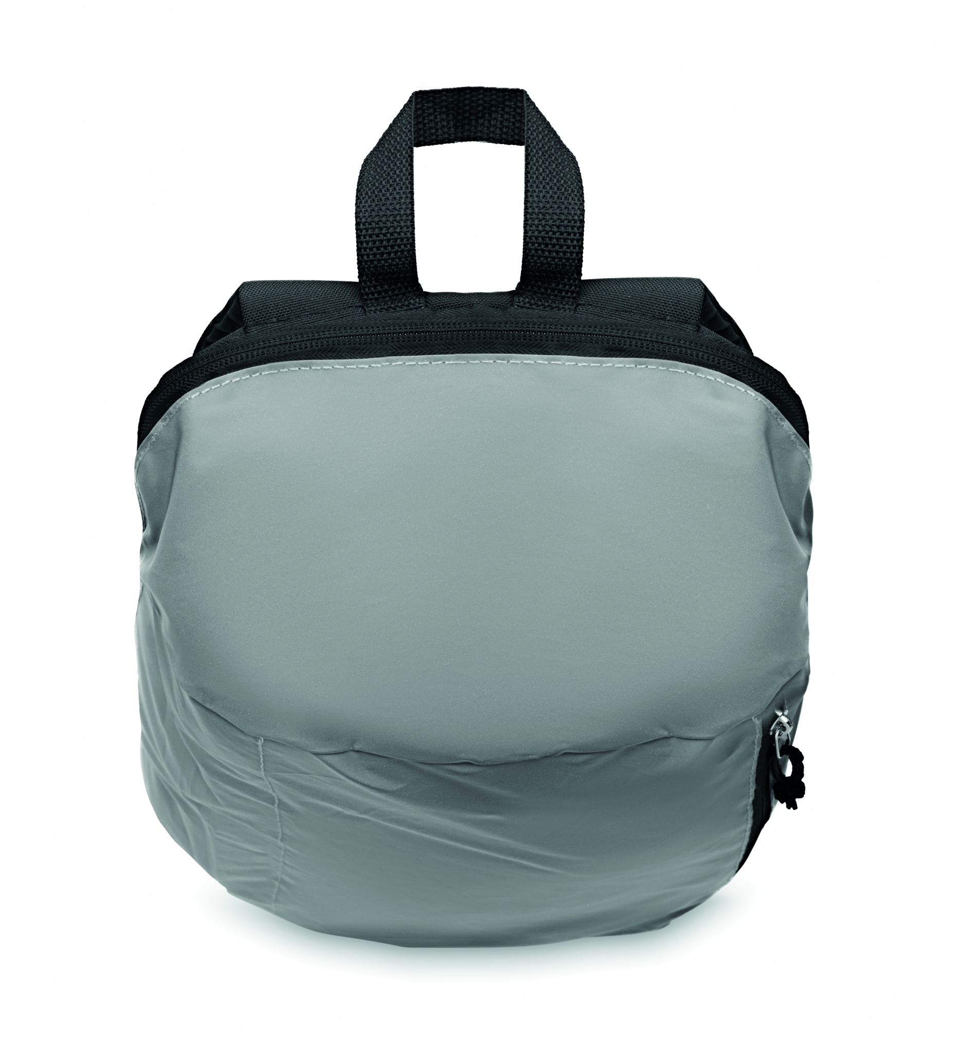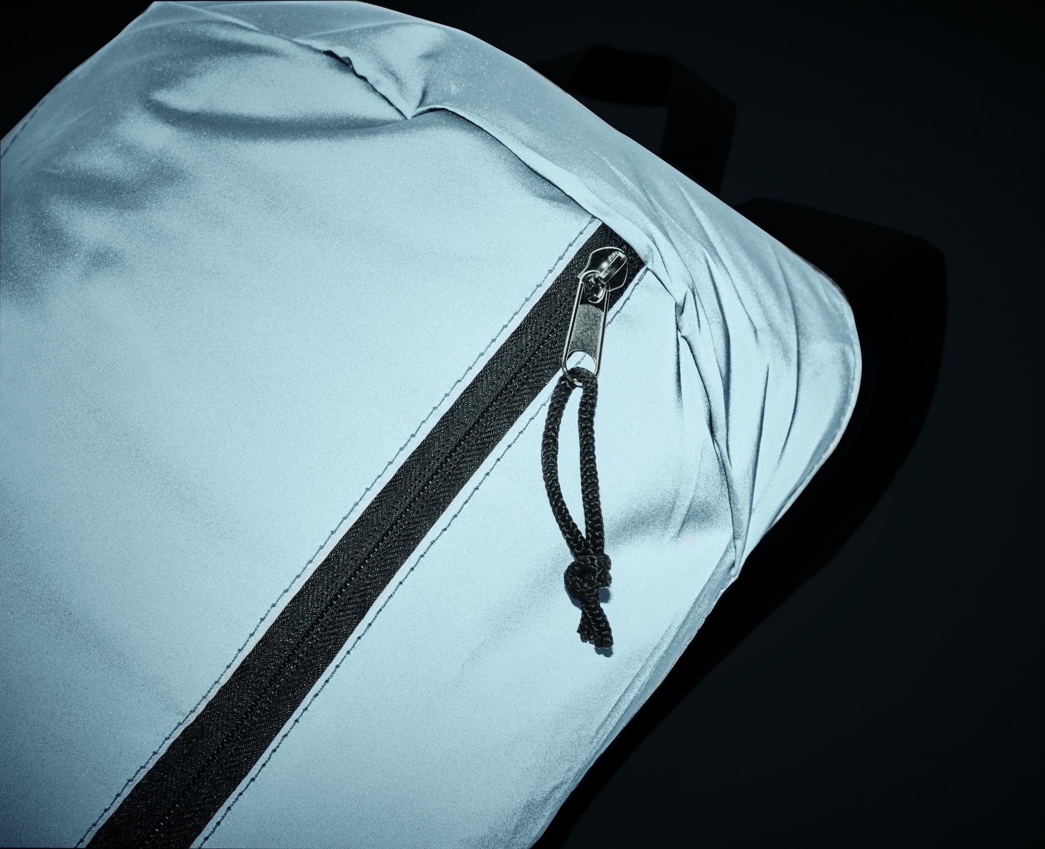 Heijastava reppu 600D polyesteristä. Repussa on vetoketjullinen päällitasku ja pehmustettu selkäosa.