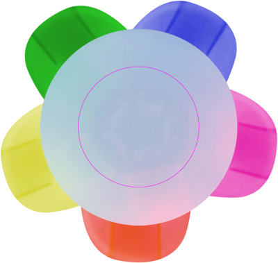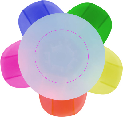 Highlighter viidellä eri värillä ja suurella mainostilalla keskellä. Painamme logosi korostuskynän keskelle.