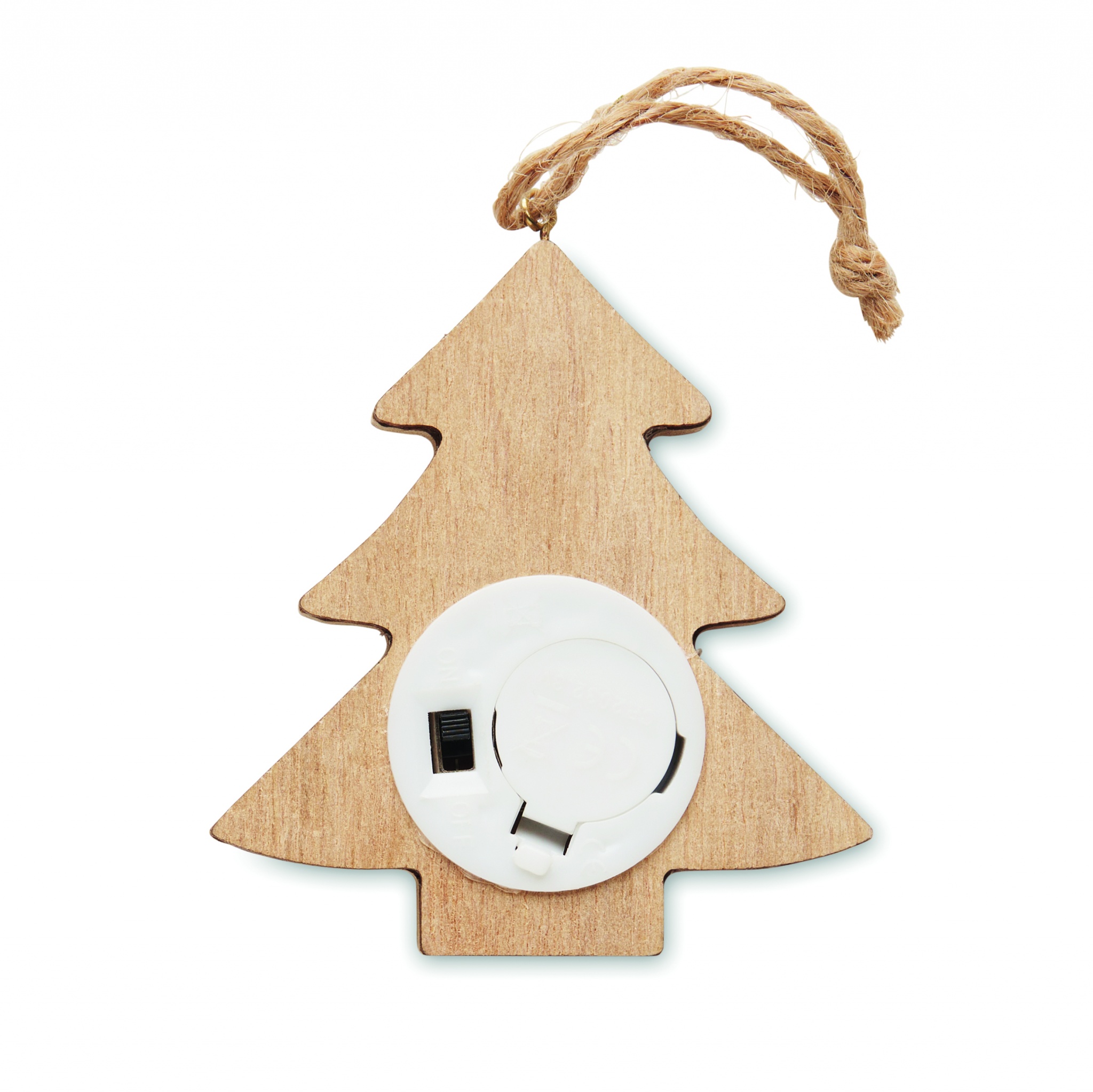 Puusta valmistettu (80 % poppelipuuta ja 20 % hamppua) kuusikoriste, jossa 6 LED-valoa ja ripustusnaru. Mukana 1 CR2032-paristo.