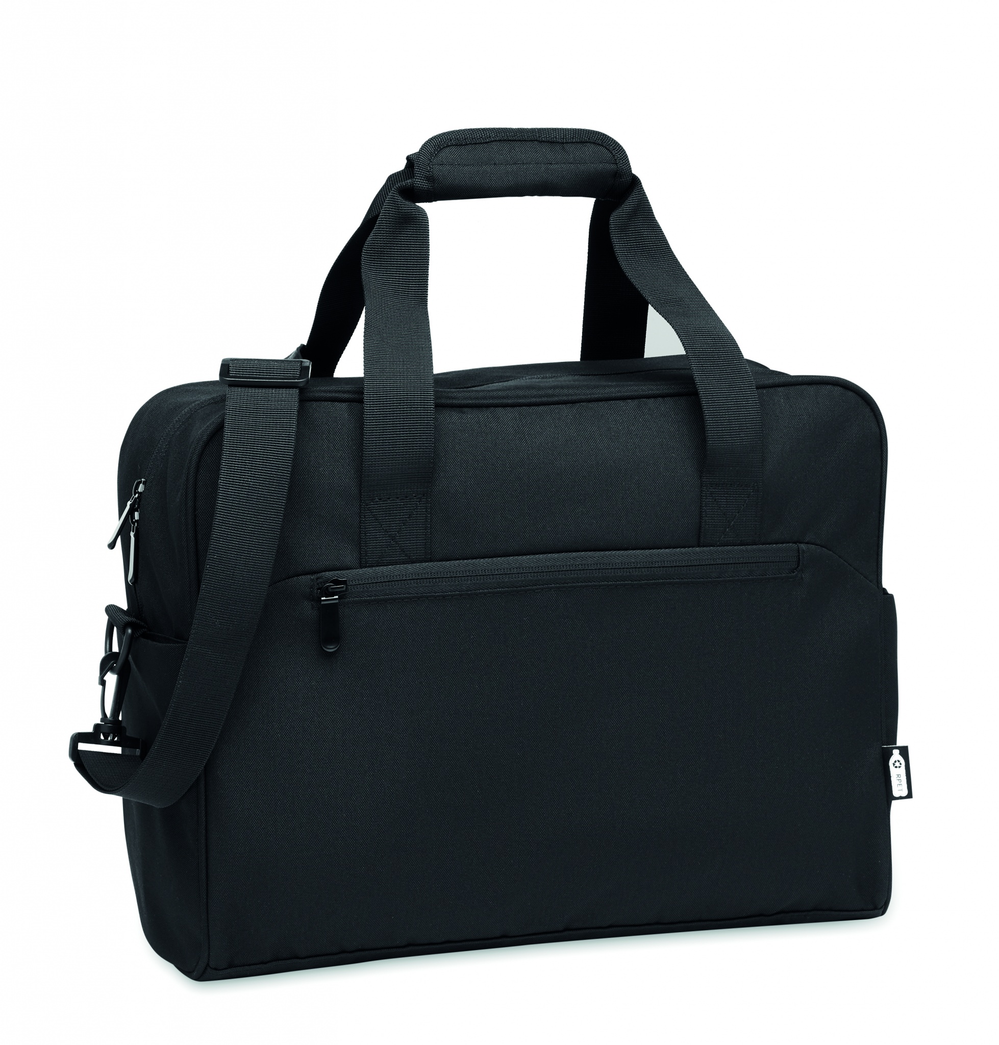 Käsimatkatavaralaukku 600D RPET:stä, jossa on suuri vetoketjullinen etutasku, kaksi pientä sivutaskua. Sisältää 15 tuuman kannettavan tietokoneen lokeron. Pehmustettu irrotettava ja säädettävä olkahihna. Trolleypidike kääntöpuolella.