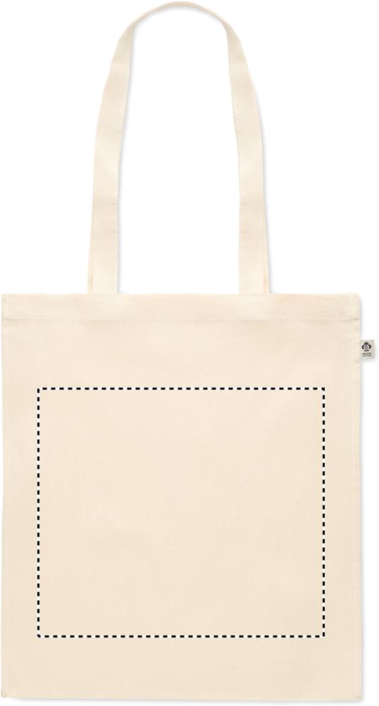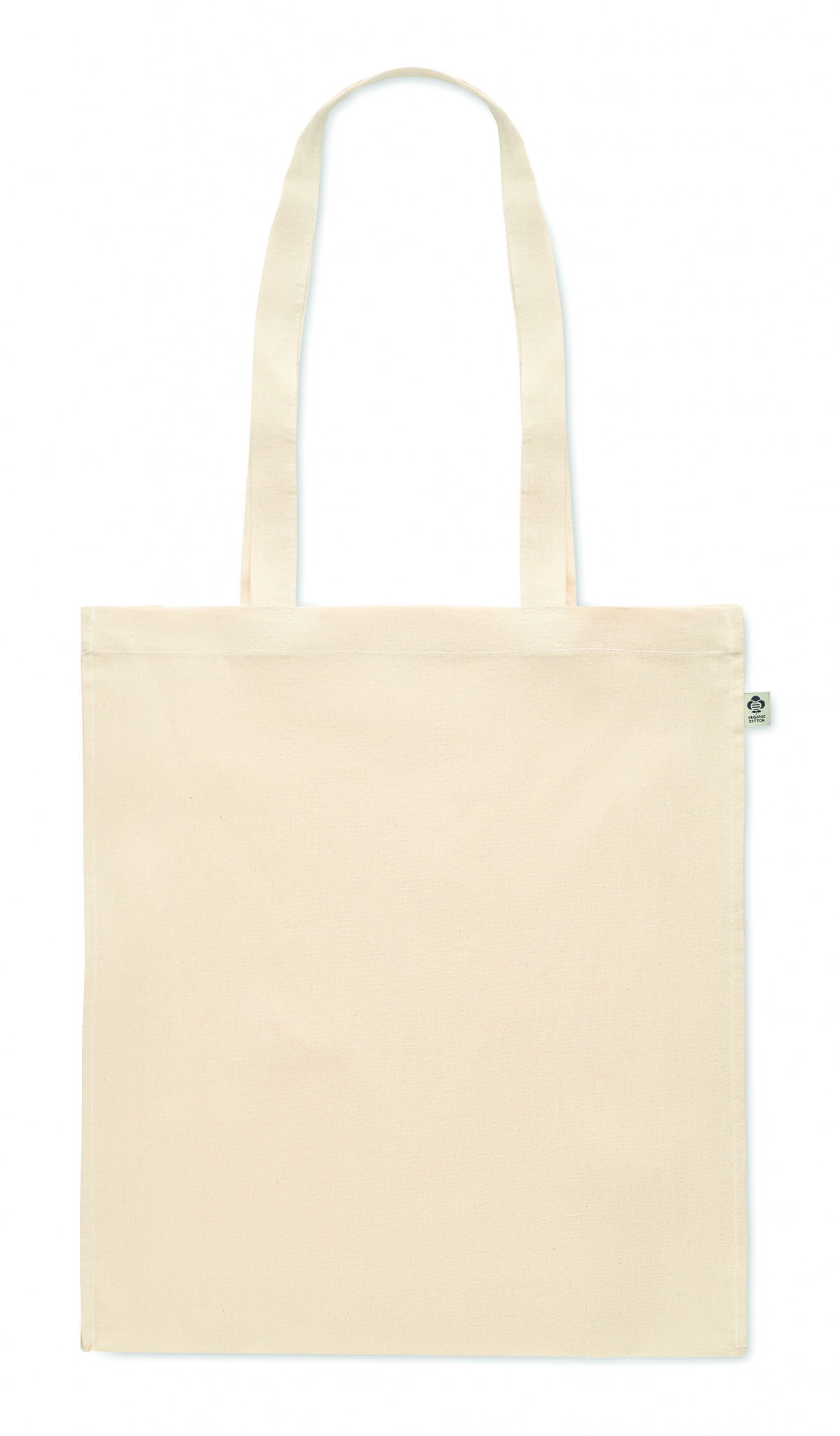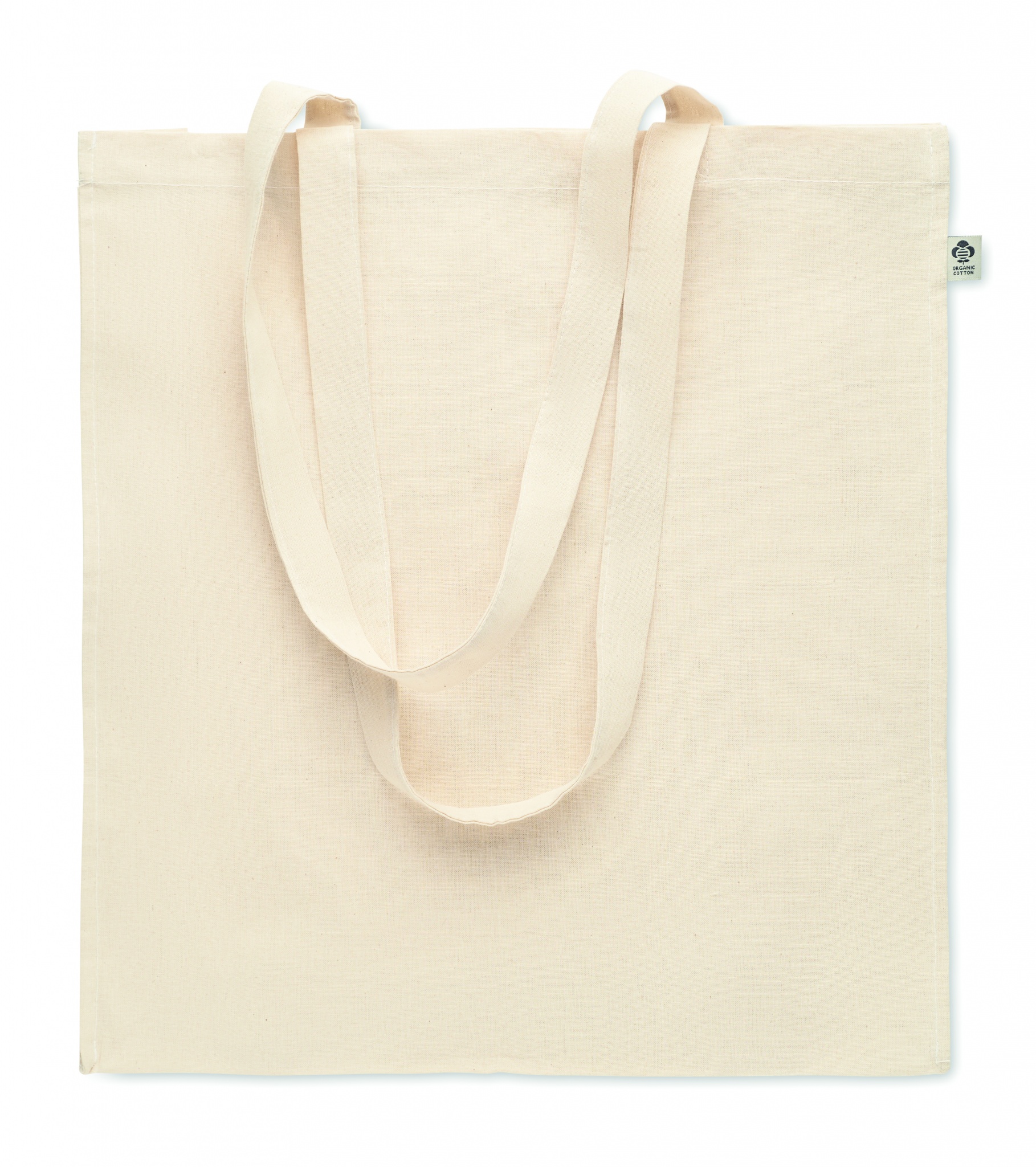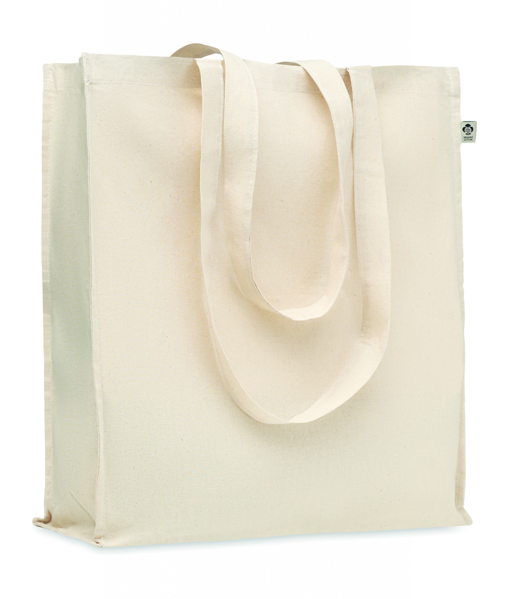 140 gr/m² luomupuuvilla kassi pitkillä kahvoilla ja pohjalevikkeellä.