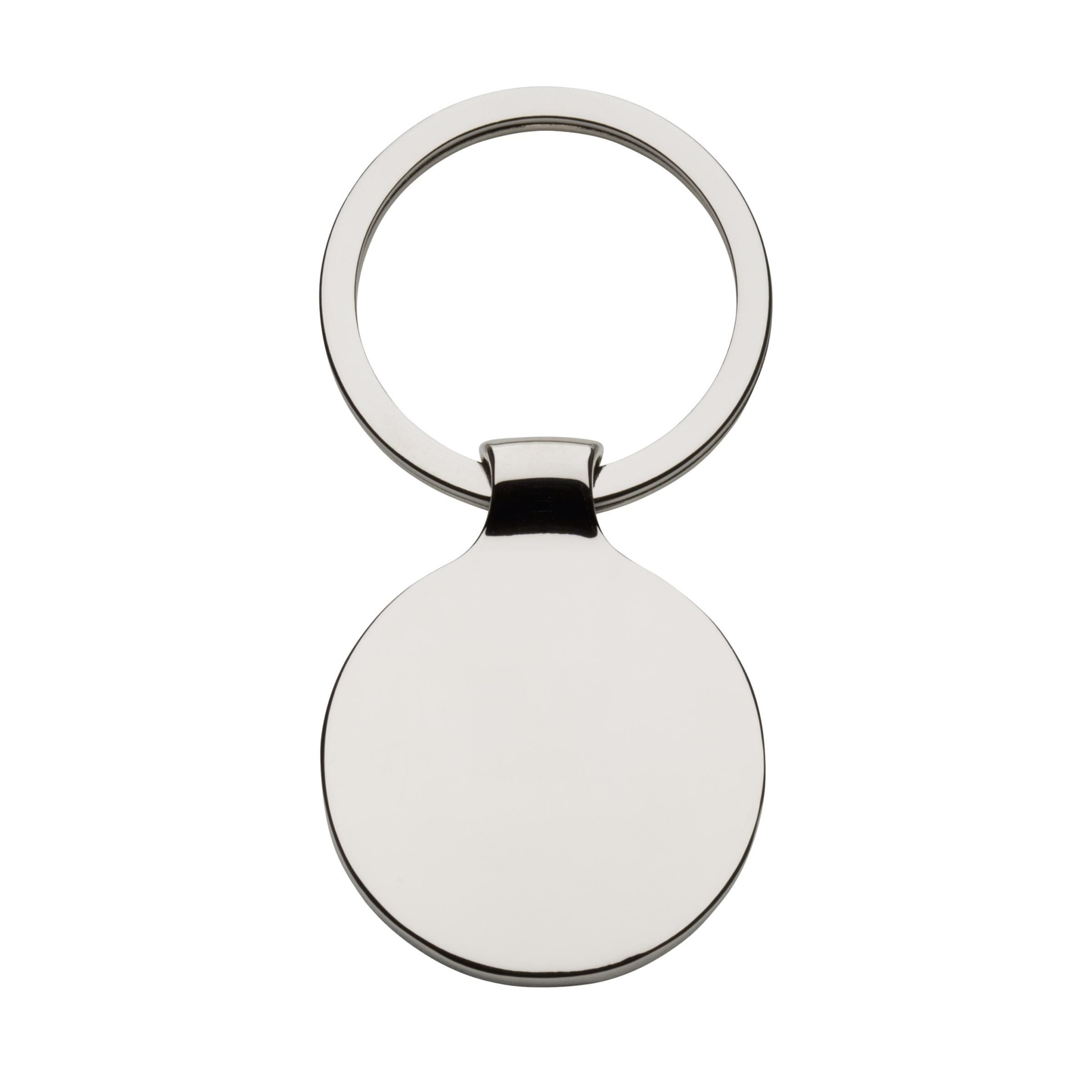 Pyöreä, kiillotettu, nikkelimetallinen avaimenperä mustalla upotekoristeella ja tukevalla avaimenperällä. Jokainen tuote toimitetaan erillisessä ruskeassa pahvikuoressa.