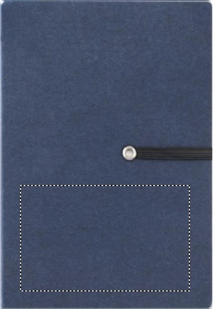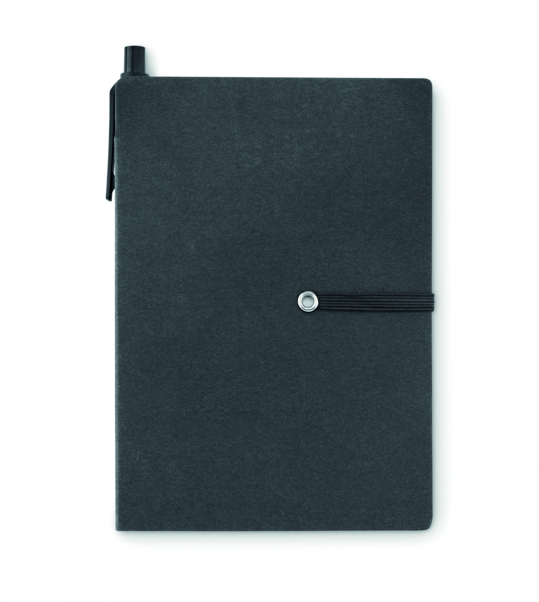 Kierrätyspaperista valmistettu muistikirja, 70 sivua viivoitettua paperia. Sisältää muistilappuja ja värillisiä indeksi tarralappuja, joustavan nauhan kirjan sulkemiseen ja kartonkisen kuulakärkikynän mustalla musteella.