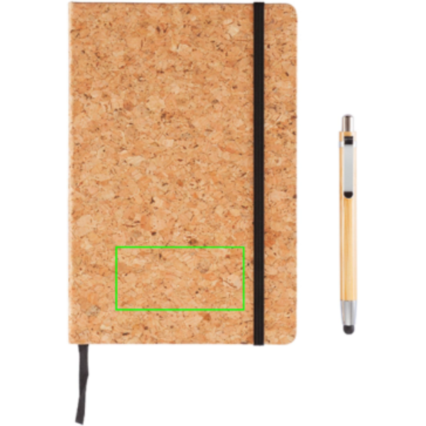 Logo trade mainoslahja ja liikelahja tuotekuva: Korkkikantinen A5-muistikirja bambukynällä