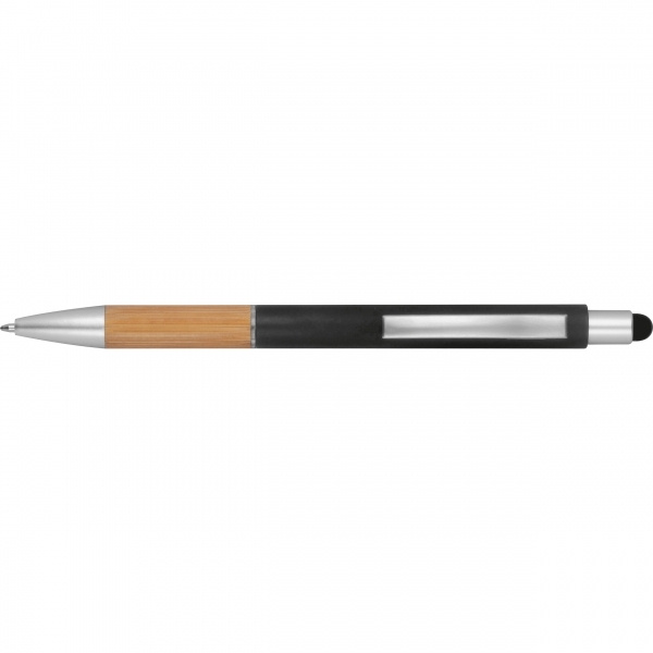 Sisäänvedettävä kuulakärkikynä, jossa bambu-ote, kosketustoiminto ja sininen täyttö. Painamme logosi klipsien viereen.