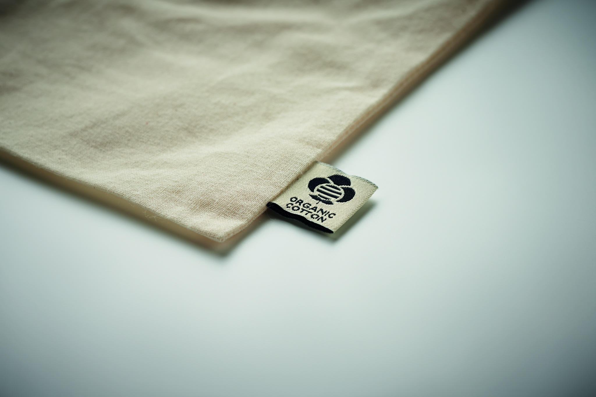 105 gr/m² suuri orgaanisesta puuvillas valmistettu pussi, kiristysnauhalla.