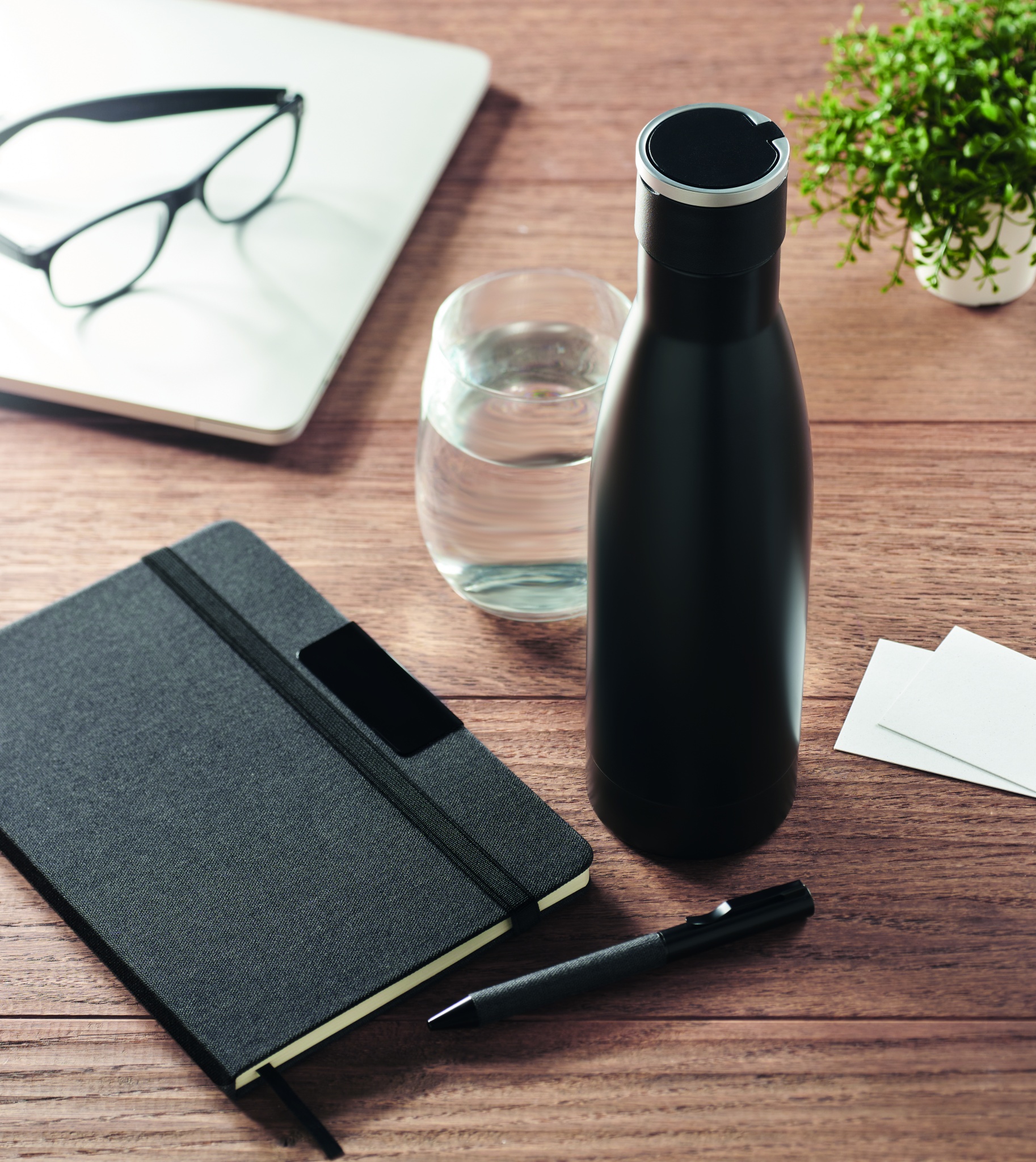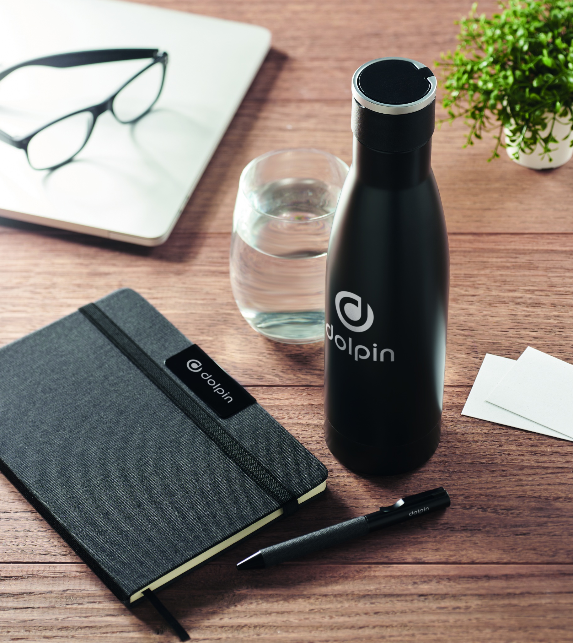 Ylellinen 3-osainen lahjasetti. Se sisältää A5-muistikirjan, jossa on kova RPET-kansi. 160 kierrätyspaperisivua (80 arkkia). sävy sävyyn joustava sulkuhihna sekä nauhallinen sivumerkintä- ja kynäteline. Settiin sopiva kierrettävä kuulakärkikynä. Kaksiseinäinen ruostumattomasta teräksestä valmistettu tyhjiöeristetty pullo. Tilavuus: 500 ml. Ylellisessä lahjapakkauksessa.