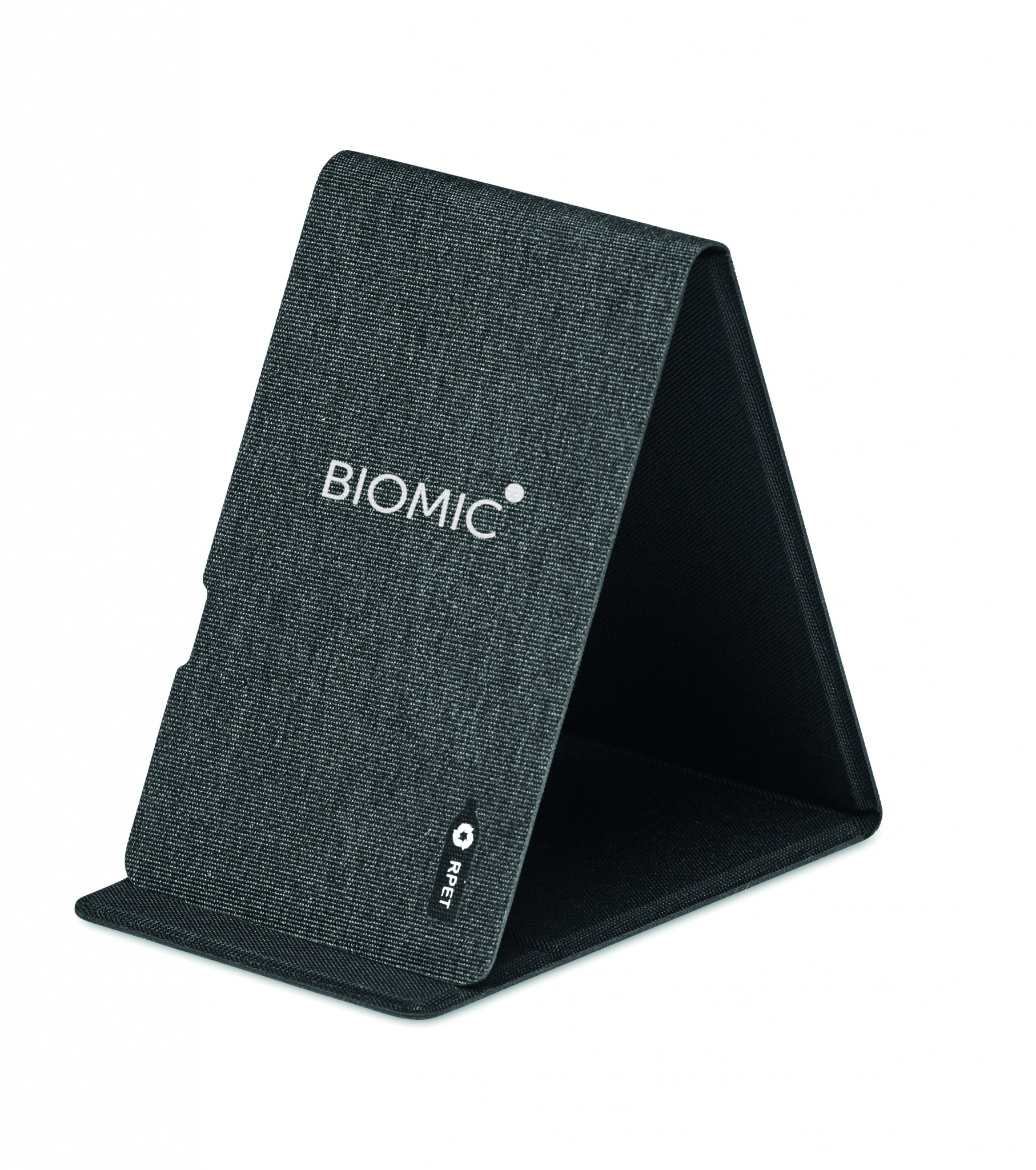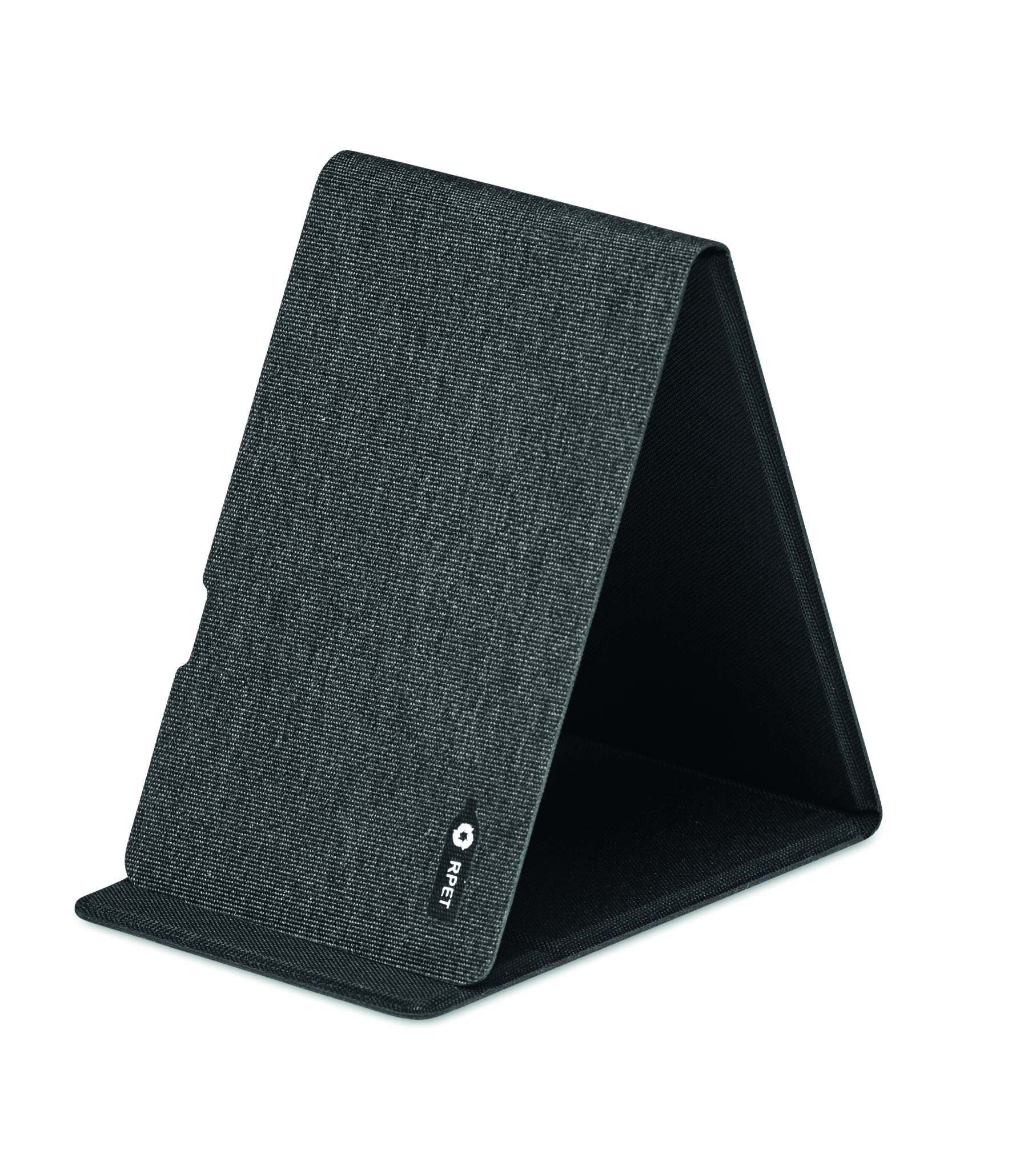 RPET 300D kaksi sävyinen langaton laturi/ puhelinpidike, lähtövirta 9V/1.6A (15W) Yhdistä laturi tietokoneeseen ja aseta älypuhelin alustalle aloittaaksesi latauksen. Yhteensopiva android, iphone8, X ja uusimpien laitteiden kanssa.