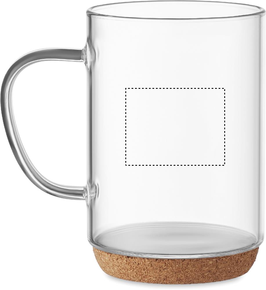 Borosilikaattilasista valmistettu 400 ml juomalasi korkki pohjalla. Borosilikaattilasiin ei voi kaiverruttaa.