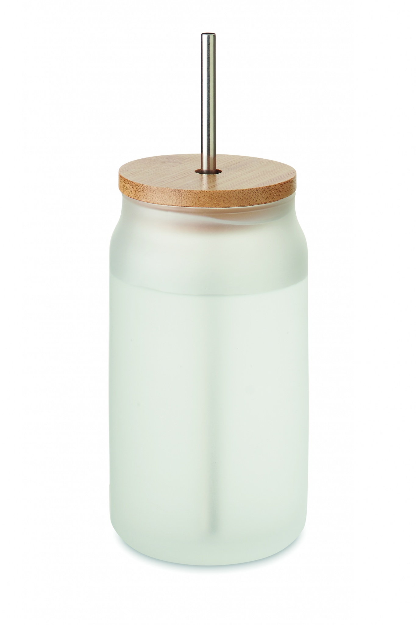 Lasipurkki, jossa on erityinen pinnoite sublimaatiopainatusta varten, bambukansi. Ruostumattomasta teräksestä valmistettu pilli. Tilavuus 400 ml.