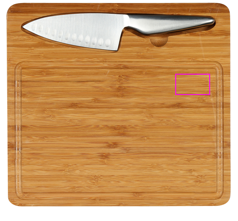 Kaunis bambusta valmistettu leikkuulauta integroidulla yleisveitsellä ruostumattomasta teräksestä. Veitsi on kiinnitetty syvennykseen magneetilla. Levitämme logosi laserkaiverruksella veitsen terään.