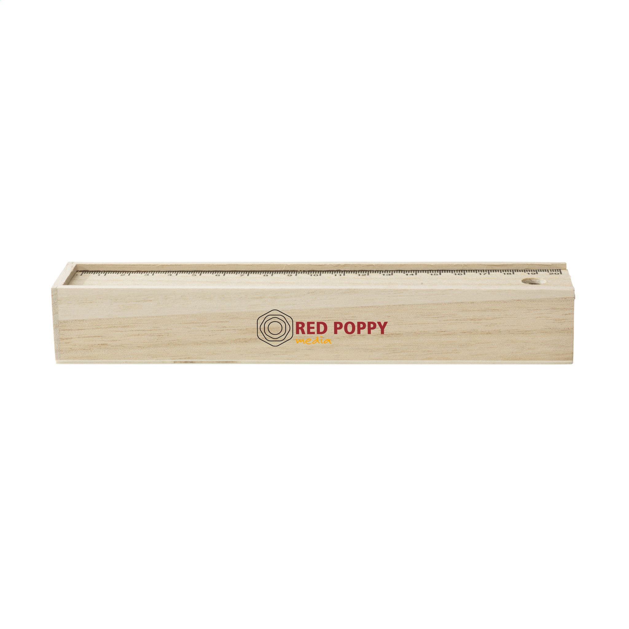 Puinen säilytyslaatikko liukuvalla kannella (20 cm viivain), 12 teroitettua, värikynää ja puinen teroitin.