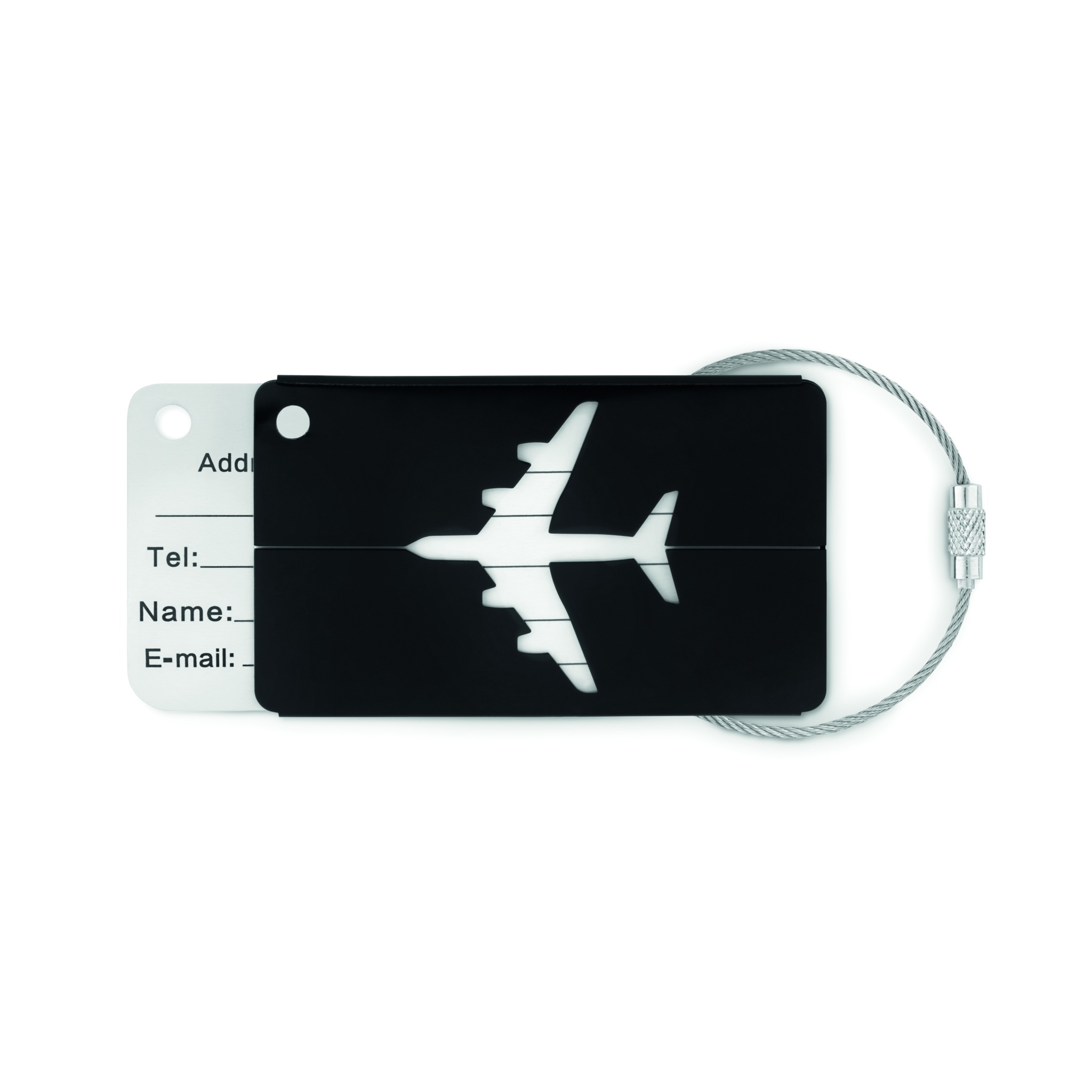 Alumiininen ''lentokone'' matkalaukkutagi, sisältää nimi ja osoite etiketin, metallisen narun.
