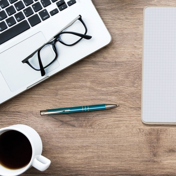 Metallinen kynä, jossa sinikirjoitus. Kaivertamme logosi klipsien alle.