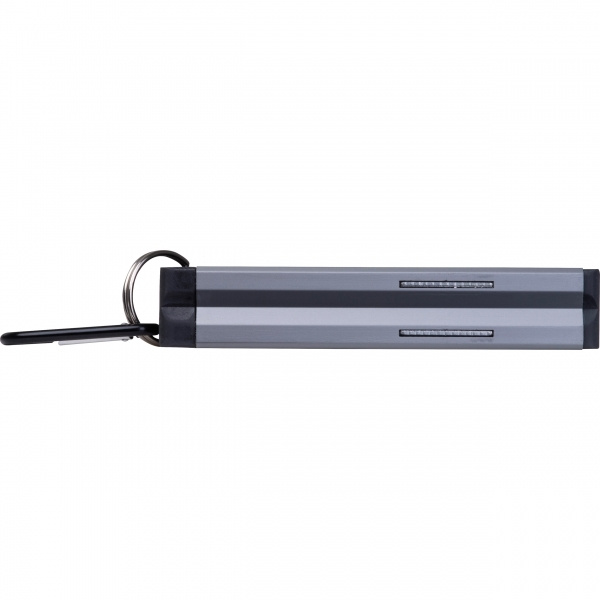 Alumiinista valmistettu minikokoinen vatupassi, jossa ABS-muoviset applikaatiot, kaksi libelliä, pohjassa magneetti ja karbiinihaka. Logosi on kiinnitetty vatupassiin laserkaiverruksella.