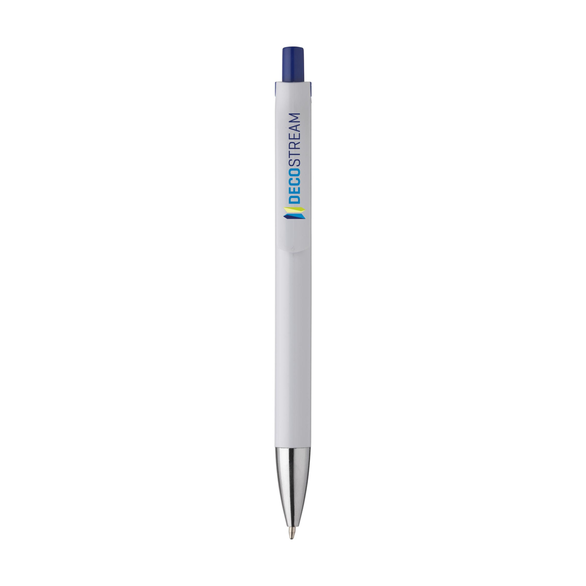 Sinisellä musteella varustettu kuulakärkikynä tyylikkäällä muotoilulla: tämän kynän runko ja pidike on integroitu. Näyttävä värikorostus klipsien alla. Tämä korostusväri vastaa painopainikkeen väriä.