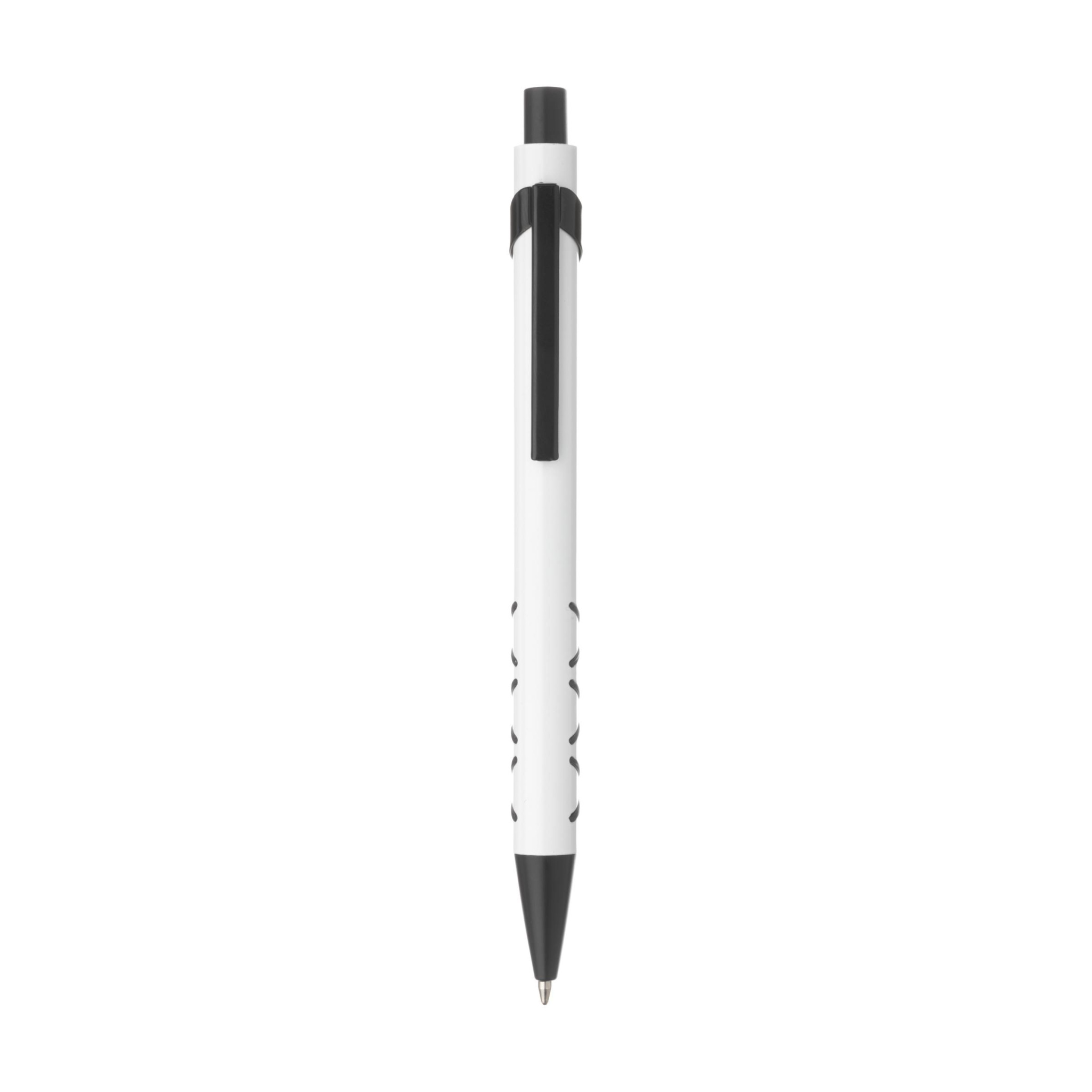 Sininen muste, alumiininen kuulakärkikynä, jossa pito, kumikorostukset piippussa, mattametallinen ulkonäkö ja metalliklipsi.
