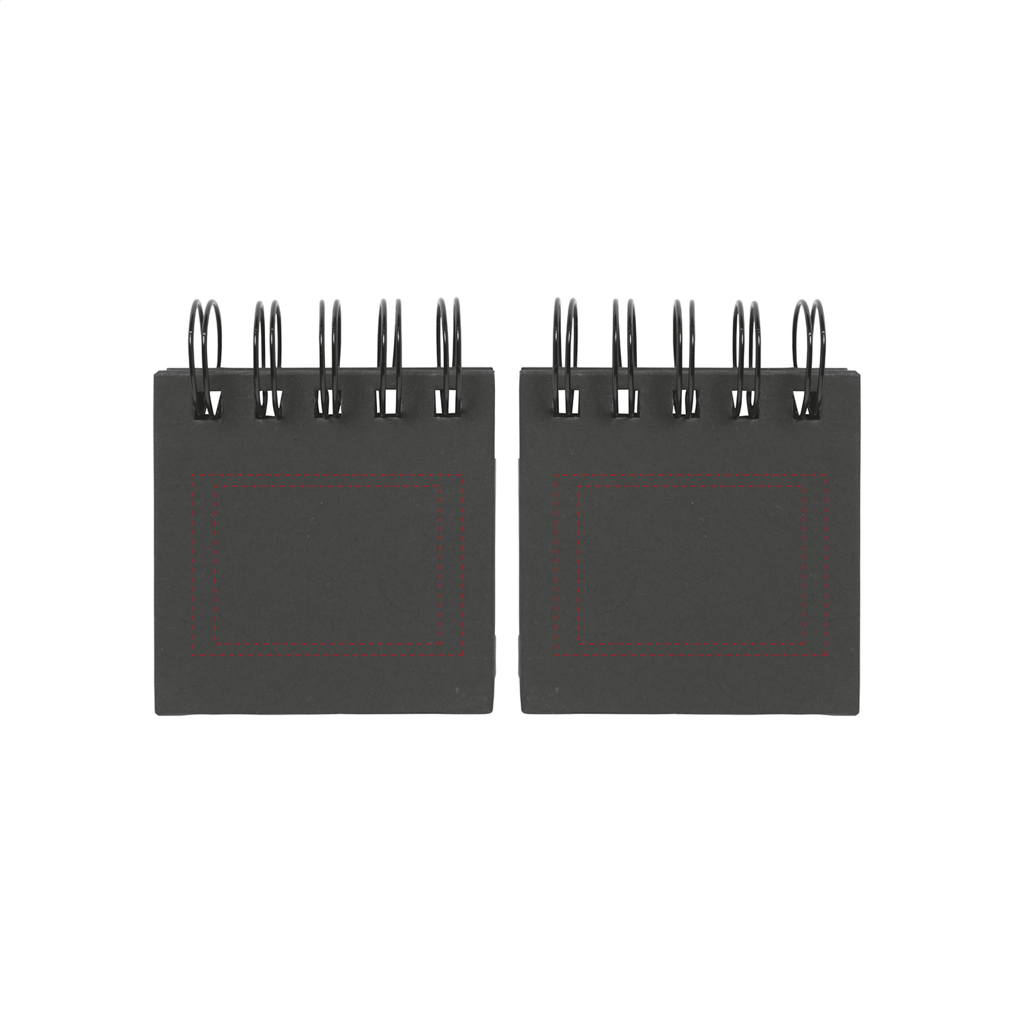 Block n. 75 itseliimautuvaa muistioarkkia ja 125 eriväristä kirjoitettavaa merkintätarraa. Kierrätetystä kartongista valmistettu kansi. Sidottu katseenvangitsijaan, metallilanka-o-sidos.