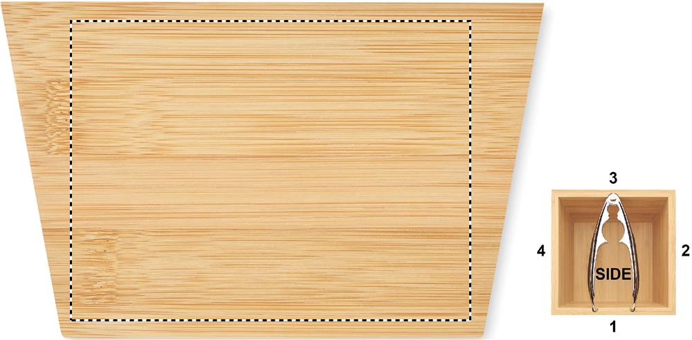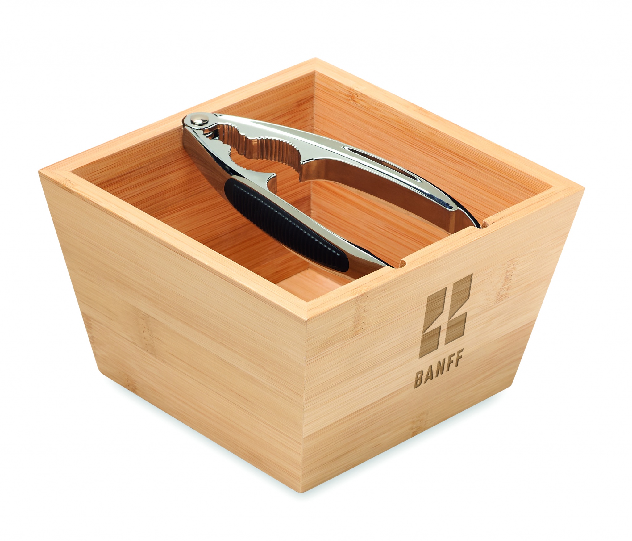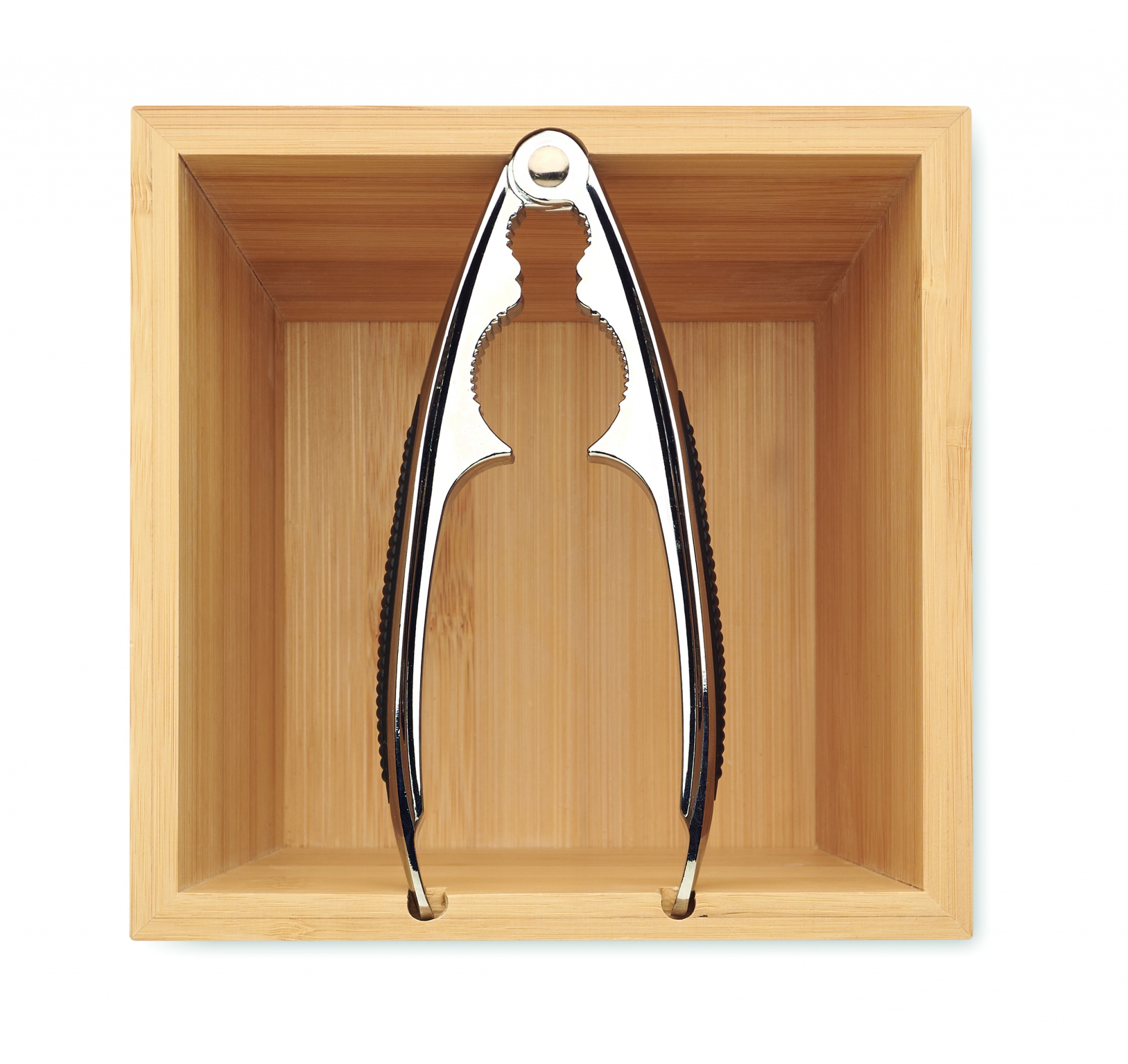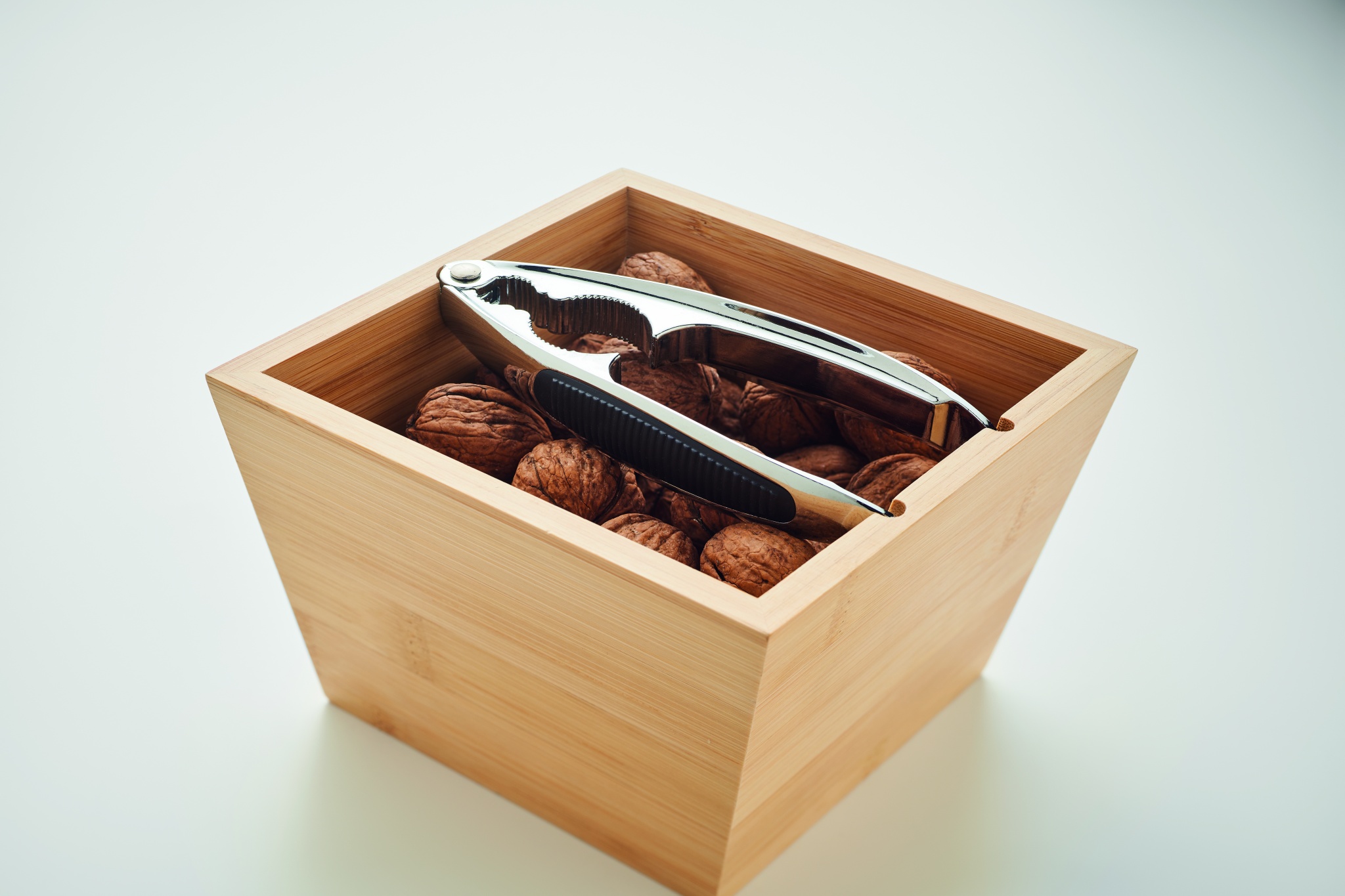 Pähkinänsärkijäsetti bambu rasialla ja hopean värinen pähkinänsärkijä TPR kahvalla.