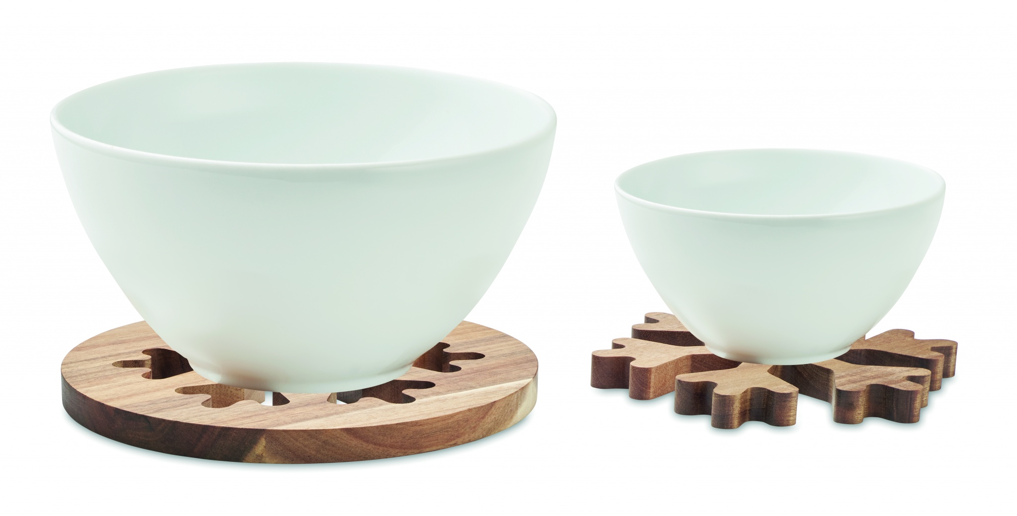 2 kpl:n setti akaasiapuisia pannunalusia lumihiutalekuvioinnilla.