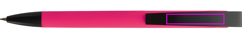 Muovinen kuulakärkikynä kumipinnoitteella ja sinikirjoituksella. Kaiverremme logosi metalliklipsiin.