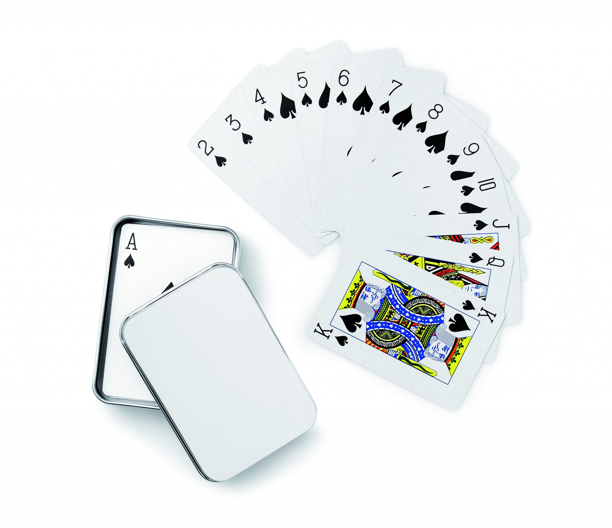 Klassiset pelikortit hopeanvärisessä tinalaatikossa, sisältää 54 pelikorttia.