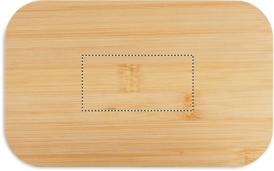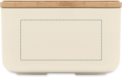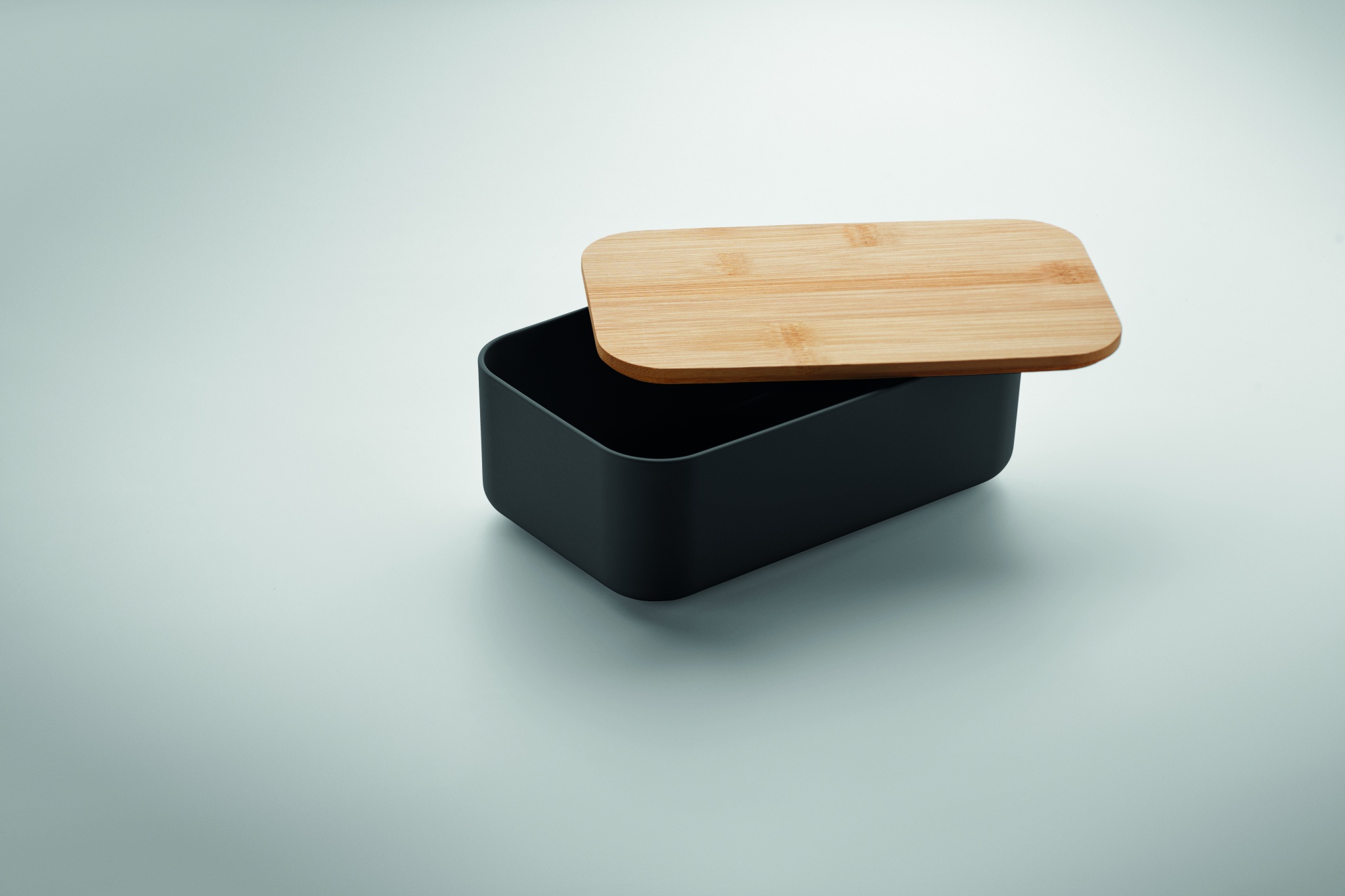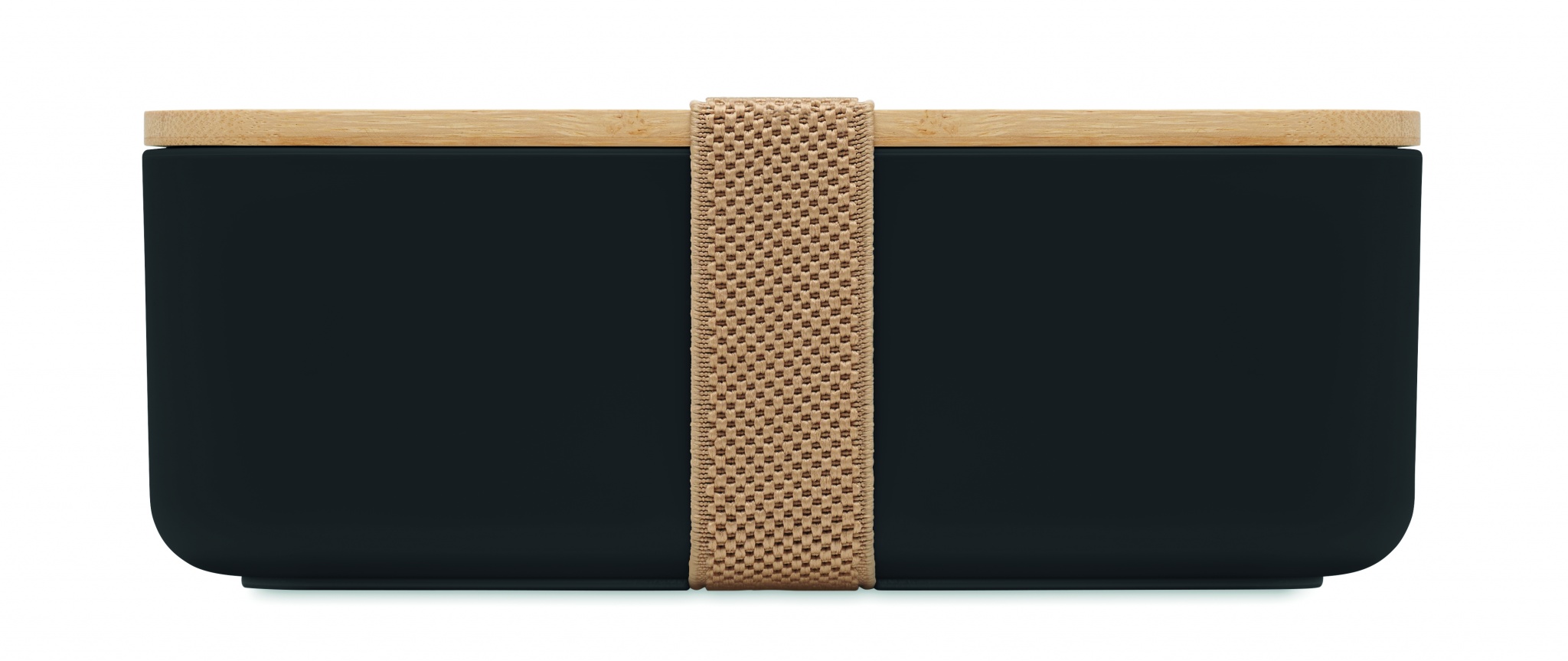 100 % PLA-maissi lounasrasia, jossa bambukansi ja RPET-kuminauhakiinnitys. Tilavuus: 1000 ml.