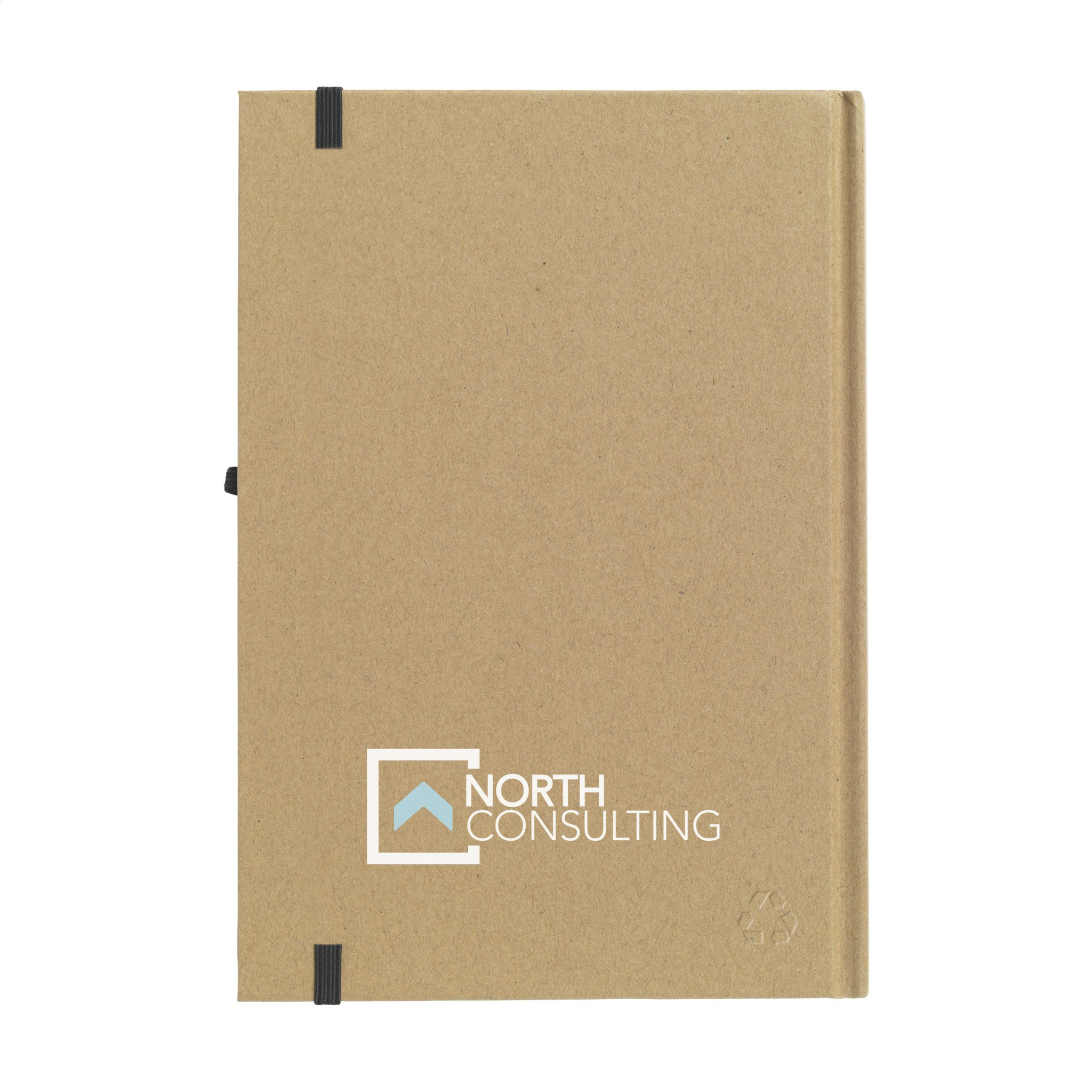 Kierrätysmateriaalista valmistettu A5-kokoinen muistikirja. Noin. 80 arkkia/160 sivua kermanväristä, vuorattua paperia (70 g/m²), kätevä kynälenkki ja joustava suljin.