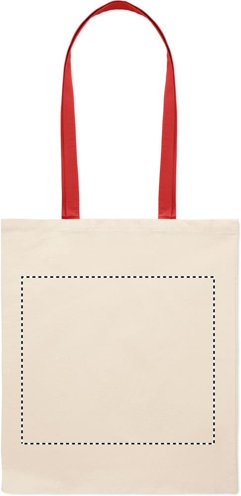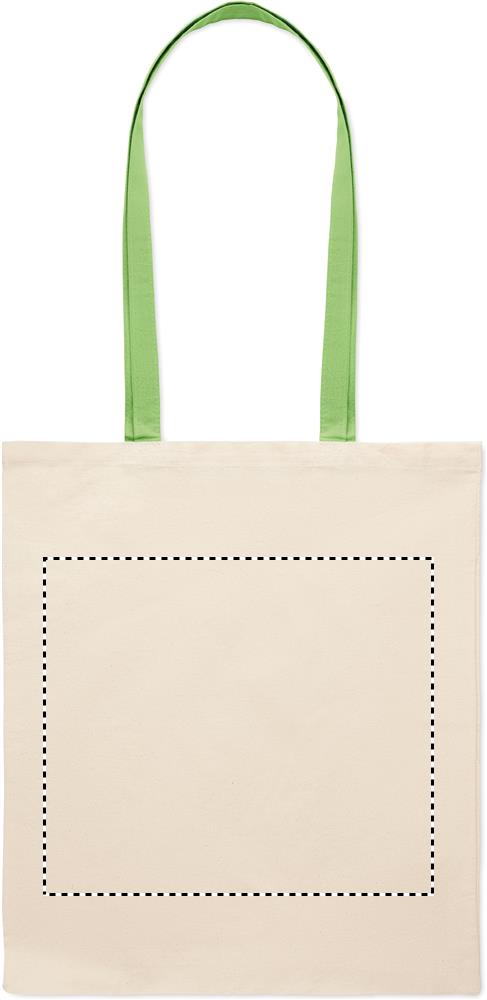 140 gr/m² puuvilla kassi, värillisillä pitkillä kahvoilla. Maksimi kanto painoraja 2,5 kiloa.