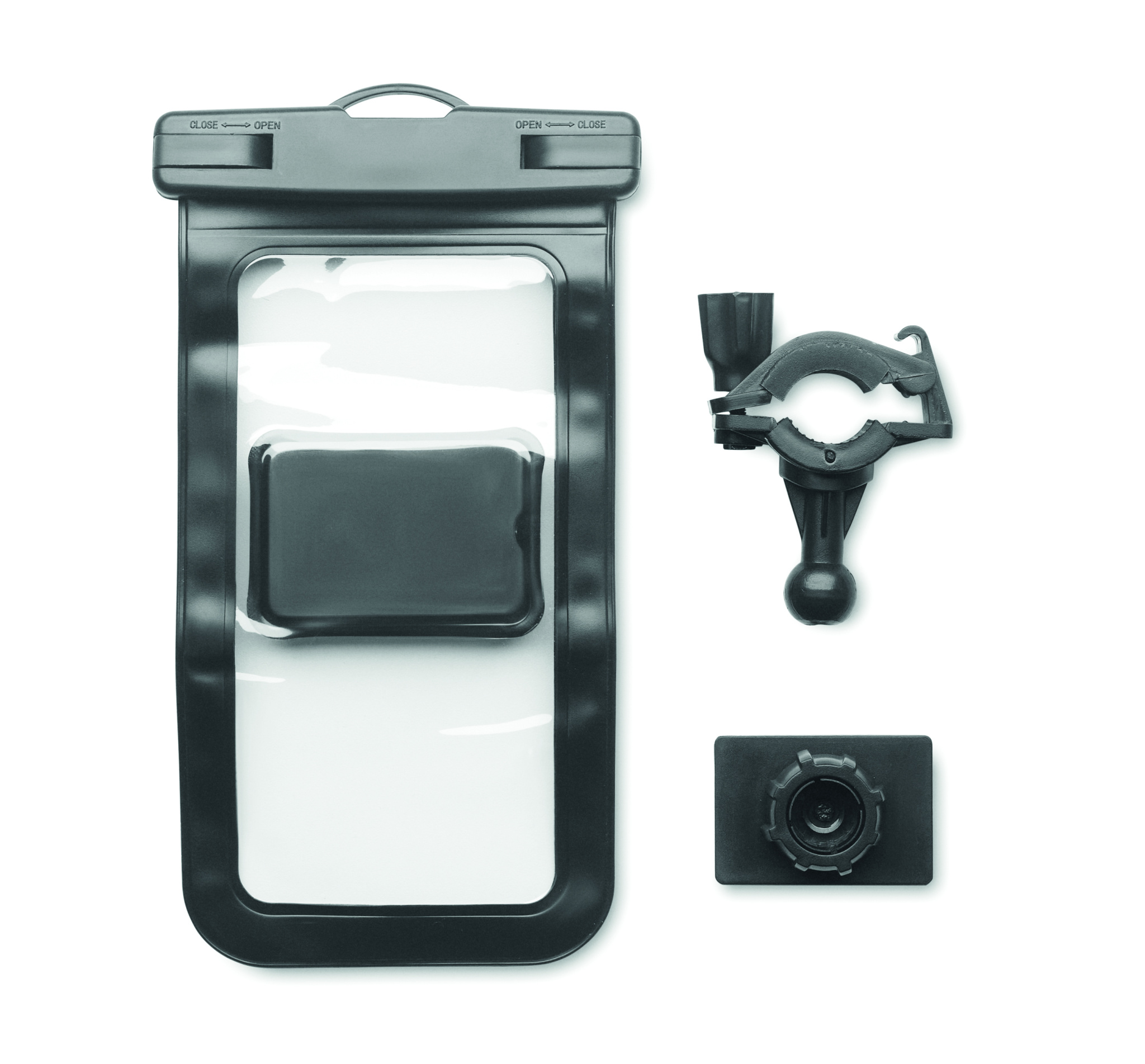 Vedenpitävä pyörän matkapuhelinteline PVC:tä, pyörii 360 astetta. Vedenpitävyysluokitus: IPX 6. Sopii 6,7 tuuman kokoon.