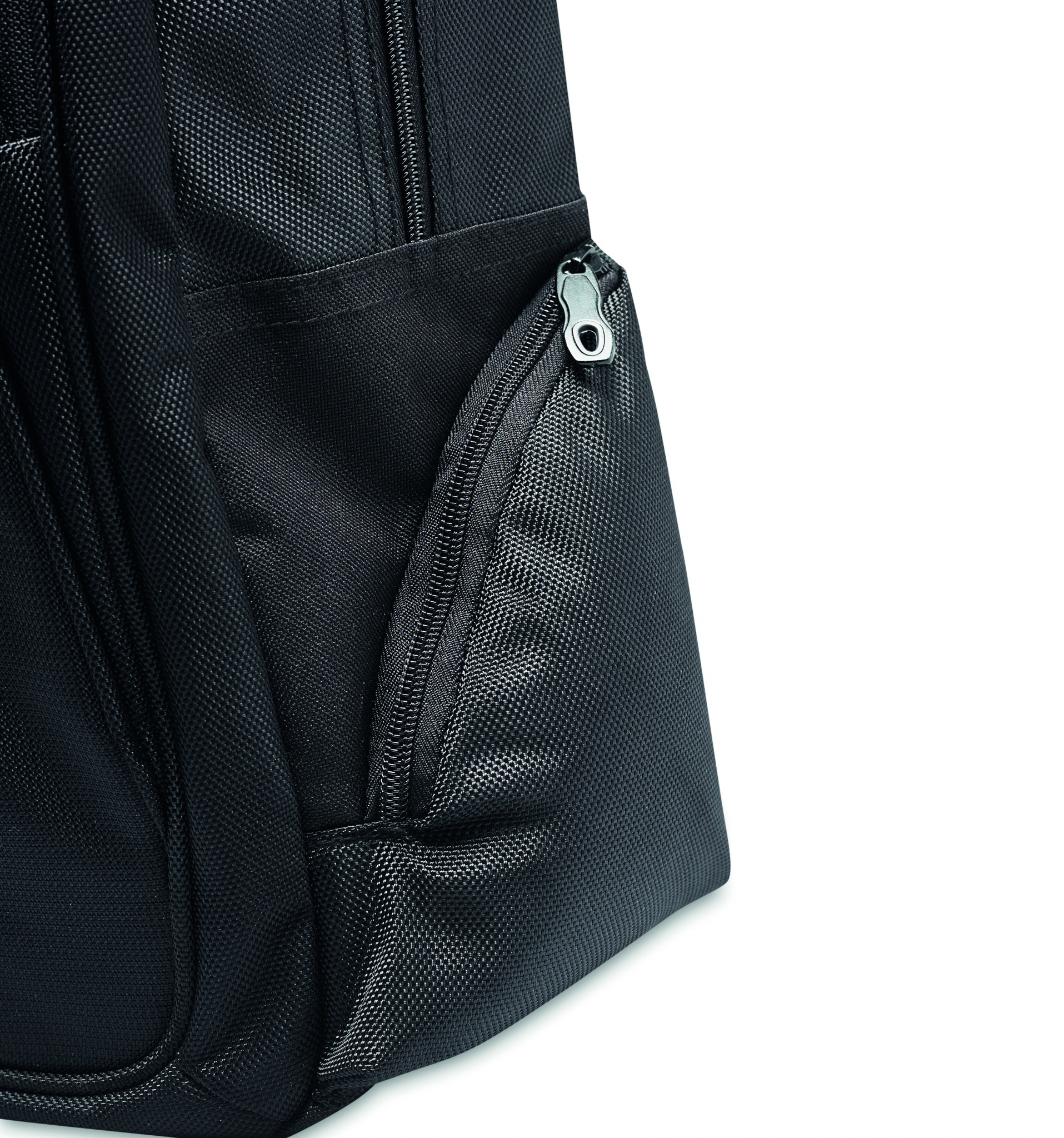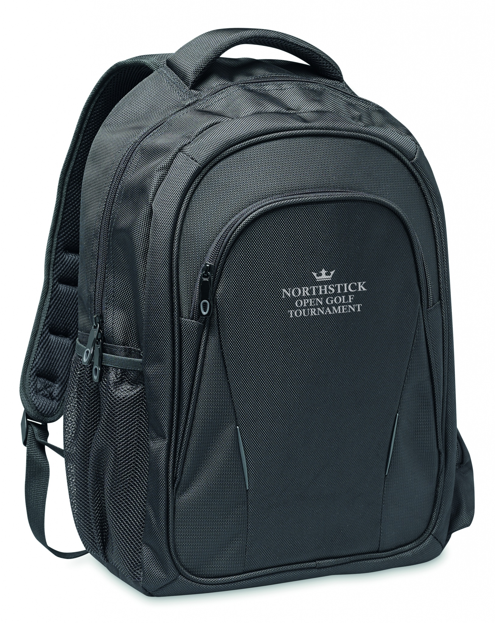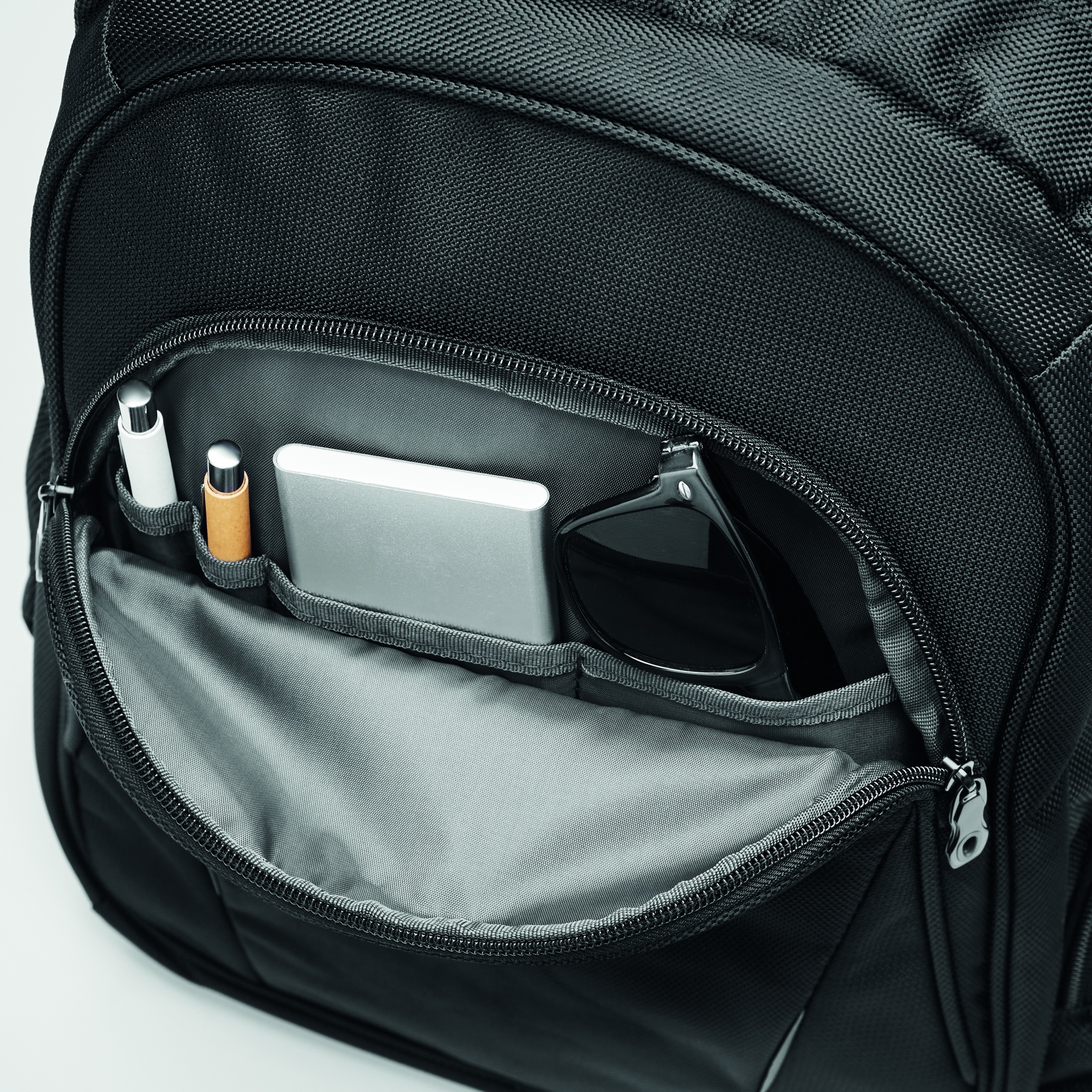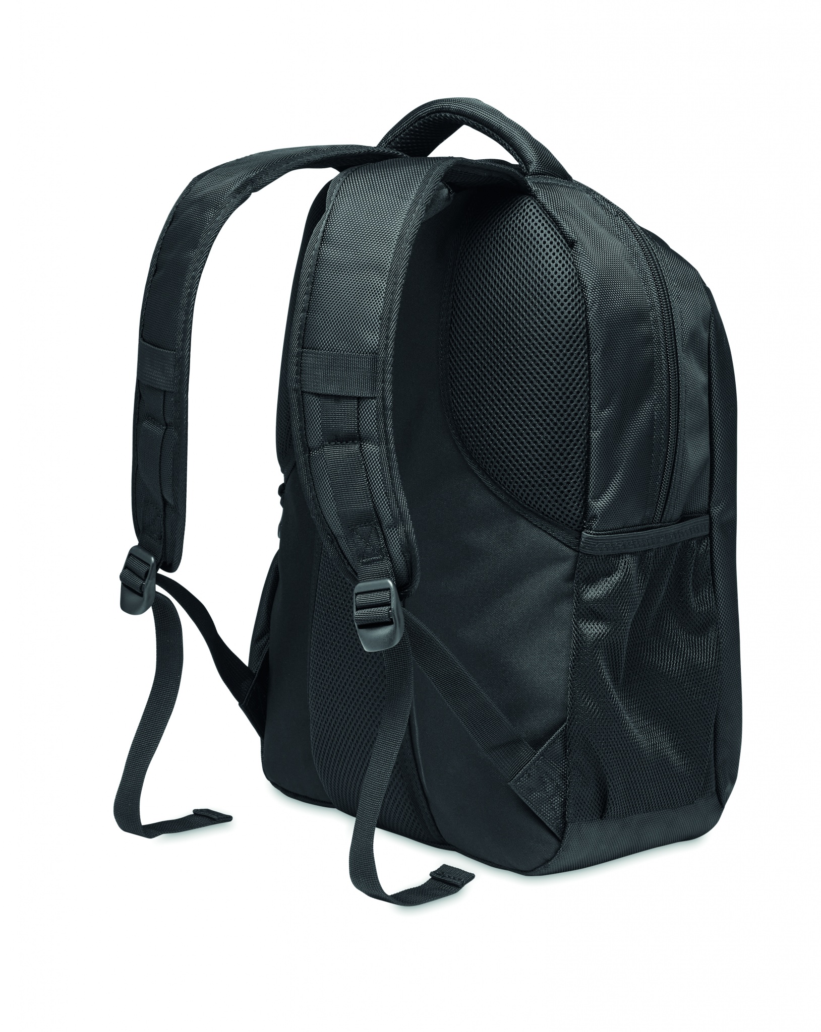 1680D polyesterinen reppu, 15 tuuman kannettavan tietokoneen taskulla. Sisältää useita taskuja ja kynänpidikkeen, pehmustettu selkä ja olkahihnat.