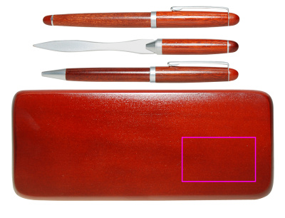 Ruusupuusetti sisältää: puisen kuulakynän kierremekanismilla ja sinikirjoituksella metallitäyttöä, puisen täytekynän sinikirjoituspatruunalla ja kirjeenavaajan. Logosi kaiverretaan laatikkoon.