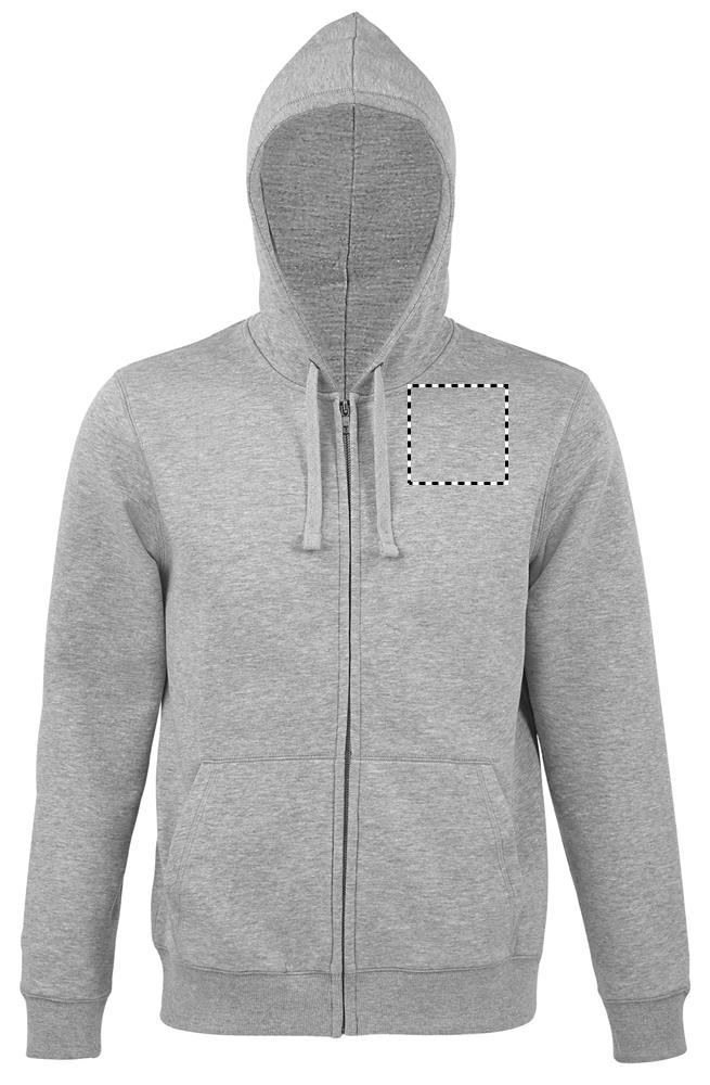 SOL'S SPIKE MEN. Miesten vetoketjullinen huppari, 80 % rengaskehrätty puuvilla - 20 % polyesteri Harjattu vuori, Ulkopuoli: 100 % puuvilla FLEECE 280 LSF (Low Shrinkage Fabric), Asetetut hihat, 2 etutaskua, Leikattu ja ommeltu, Vuorattu huppu, jossa on sävyyn sopiva kiristysnyöri, 2x2-ripsiset hihansuut ja helma. Puolikuun muotoinen sisäkaulus, teipattu kaula-aukko, YKK-vetoketju. OEKO-TEX®. Myydään vain painatuksen kanssa.