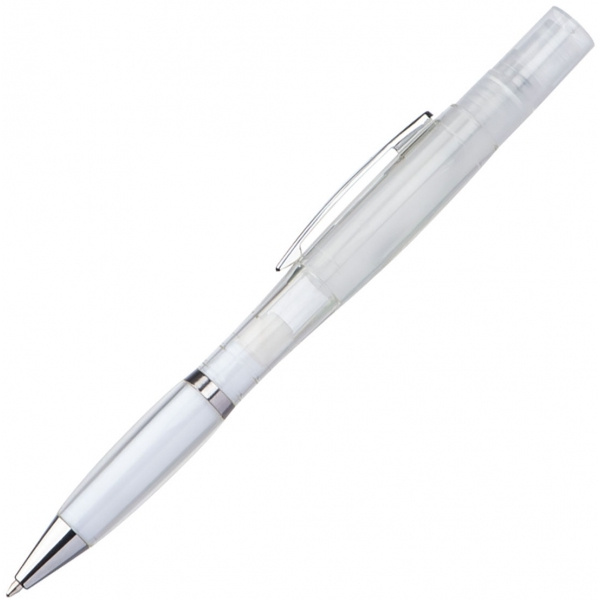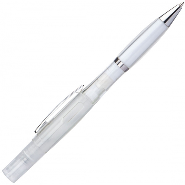 Läpinäkyvä Twistpen hopeanvärisillä sovelluksilla ja sinikirjoituksella täyttökappaleella. Suihkutin on täytettävä - täydellinen hajuvesi- tai desinfiointinesteille. Painamme logosi pidikkeen oikealle puolelle.