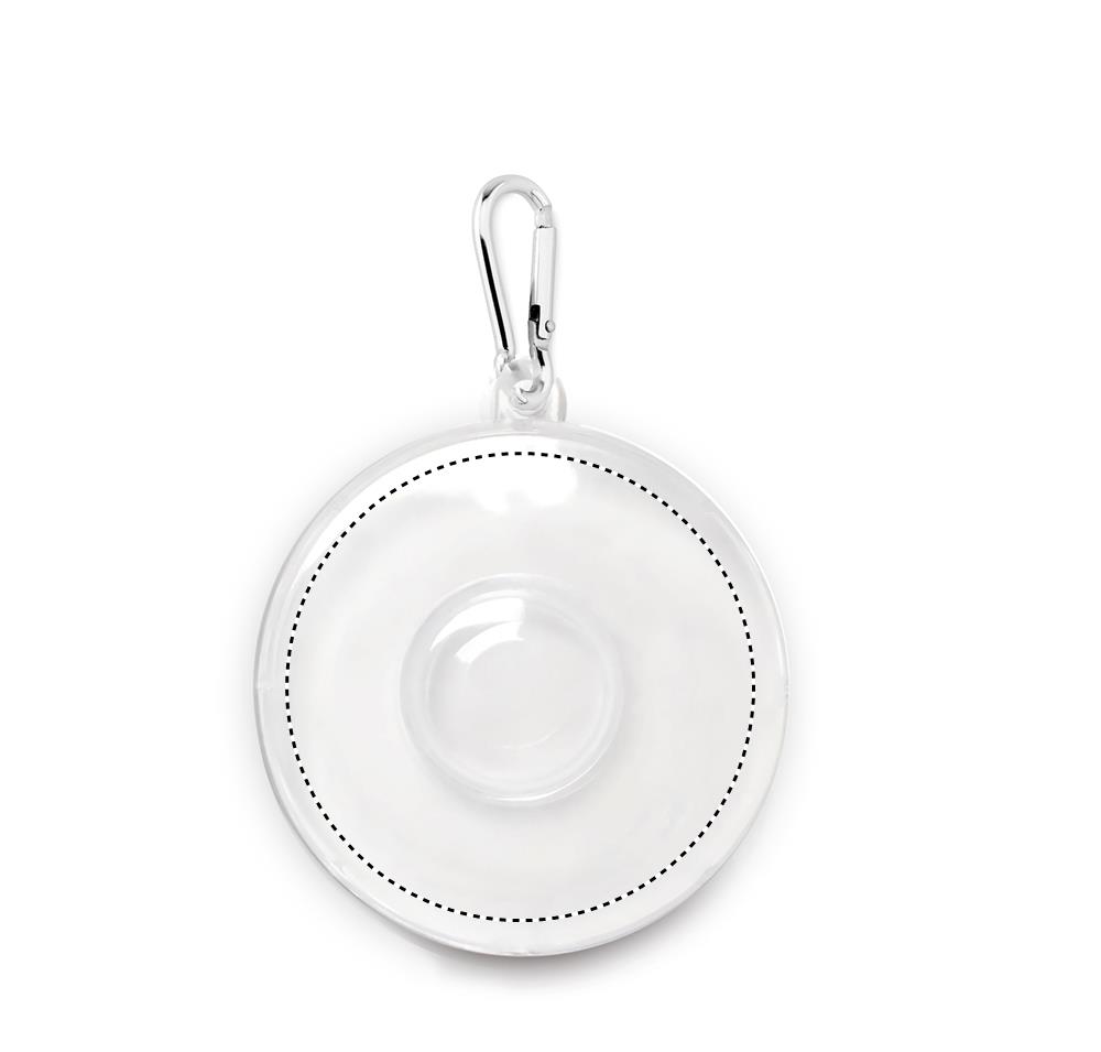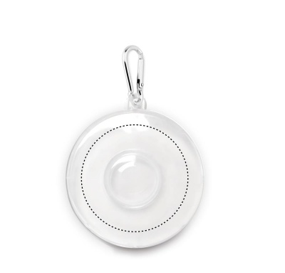 Taitettava silikonikuppi, pillerisäiliöllä ja karabiinikoukulla.