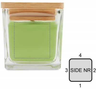 Tuoksuva kasvipohjainen vahakynttilä nelikulmaisessa lasipurkissa, jossa on bambukansi. 50 g. Paloaika: 8 tuntia.
