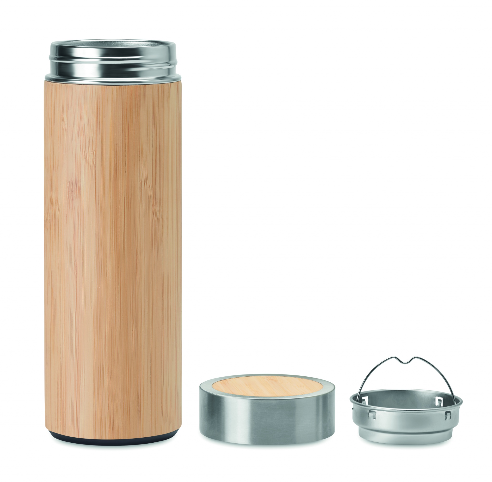 Kaksiseinäinen ruostumattomasta teräksestä valmistettu 400 ml tyhjiötermospullo, teesiivilällä. Luonnollisen materiaalin (bambu) vuoksi, tuotteiden värissä/ koossa saattaa olla erinäisyyksiä ja tämä voi vaikuttaa painatuksen lopputulokseen.