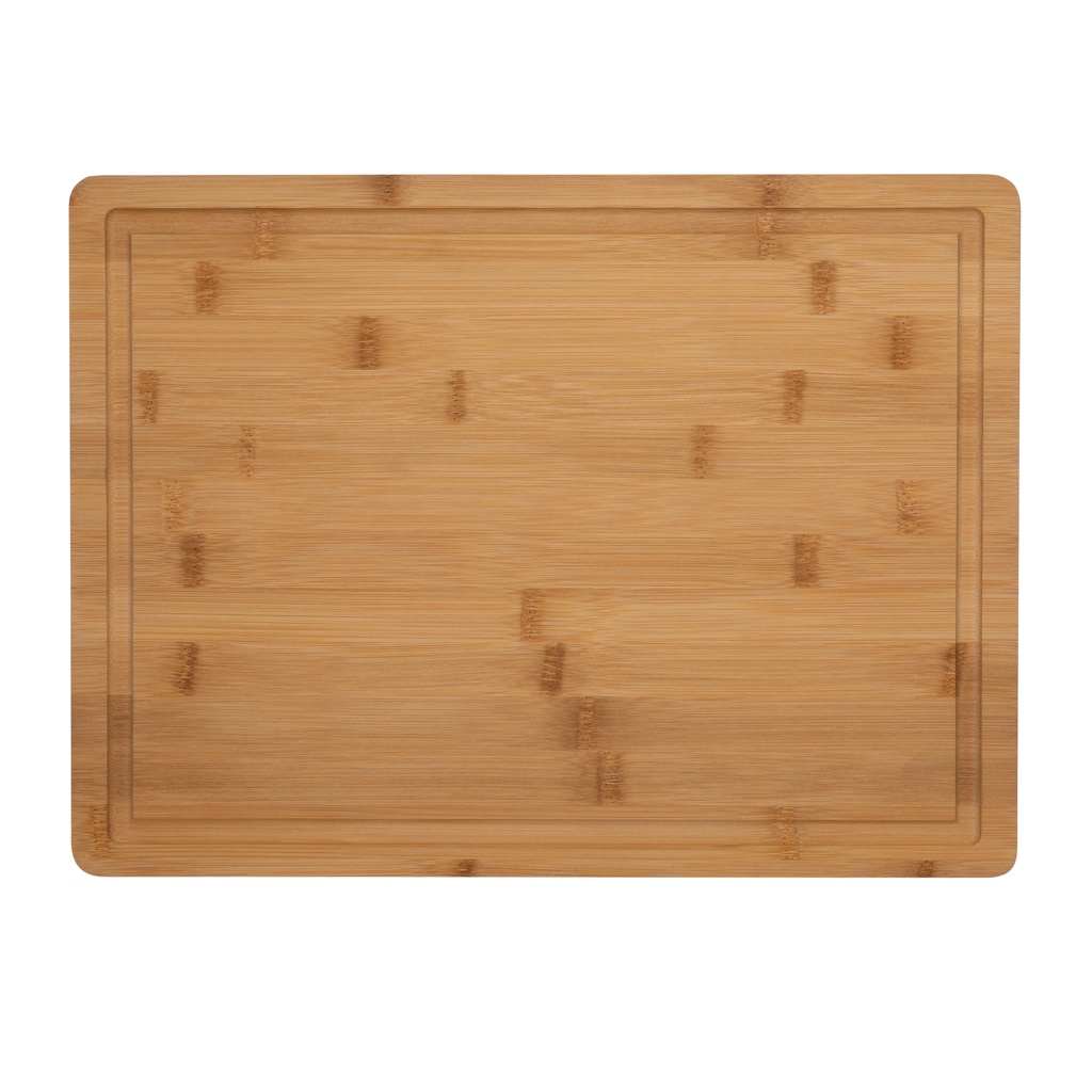 Tämä bambuinen leikkuulauta on olennainen tuote jokaiseen keittiöön. Tämä monikäyttöinen tuote on enemmän kuin vain leikkuulauta, mikä tekee siitä täydellisen sekä ruoan valmistukseen että tarjoamiseen. Leikkuulaudassa mehukouru, joka estää vuotamisen. Pakattu ylelliseen kraft-laatikkoon. Leikkuulauta ei ole käsitelty, mutta sen voi halutessa öljytä. Ei sovi astianpesukoneeseen, vain käsinpesu.