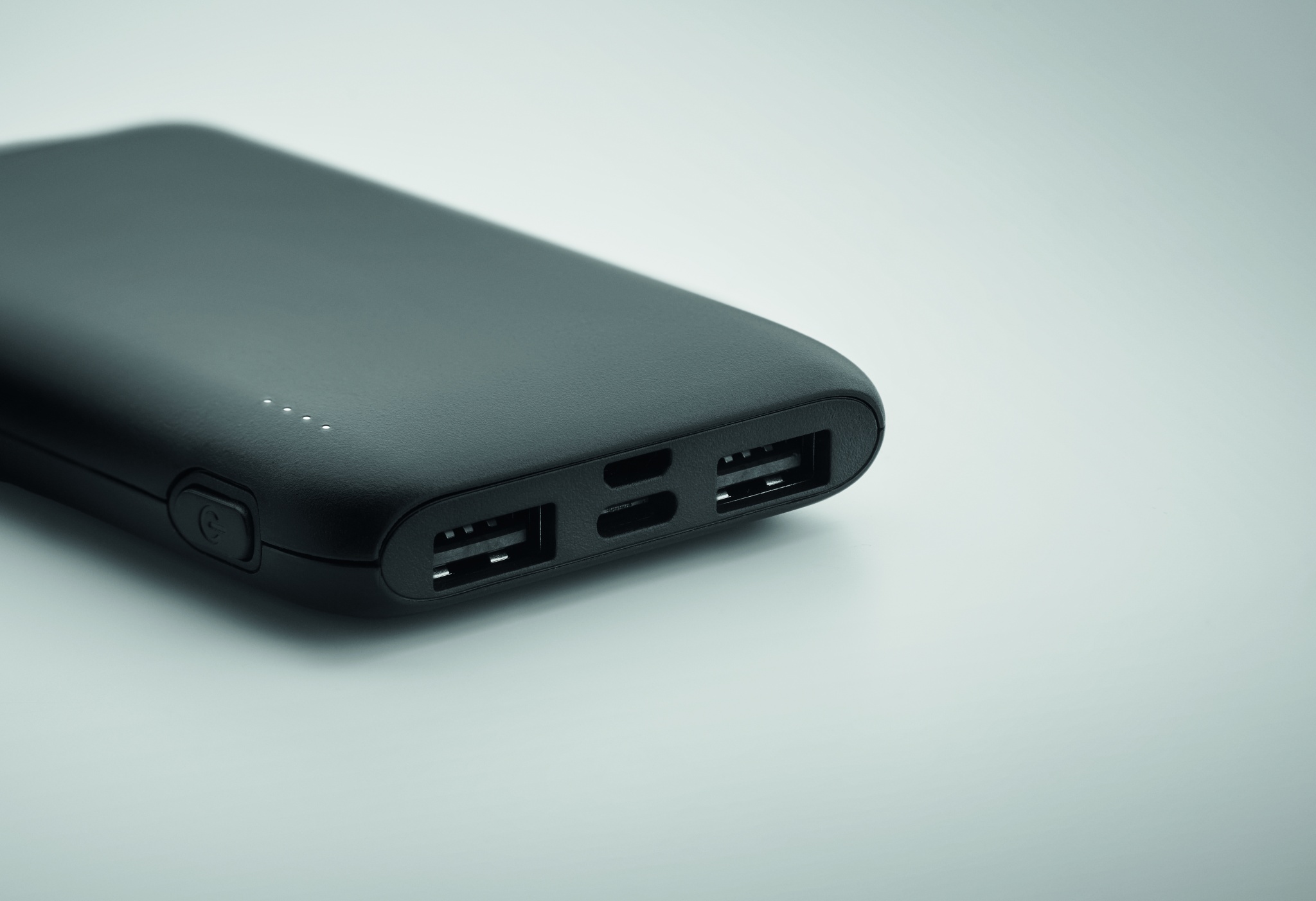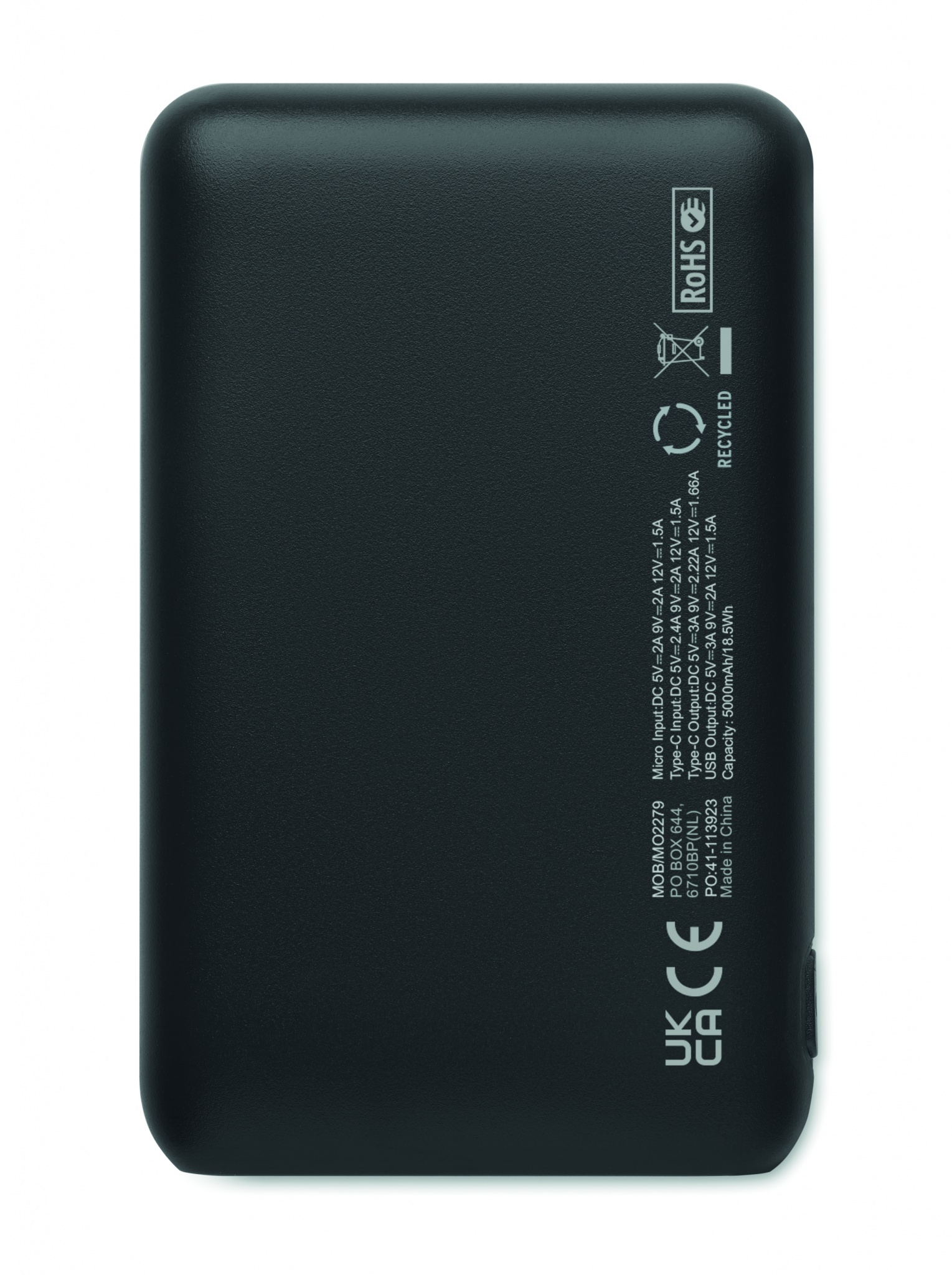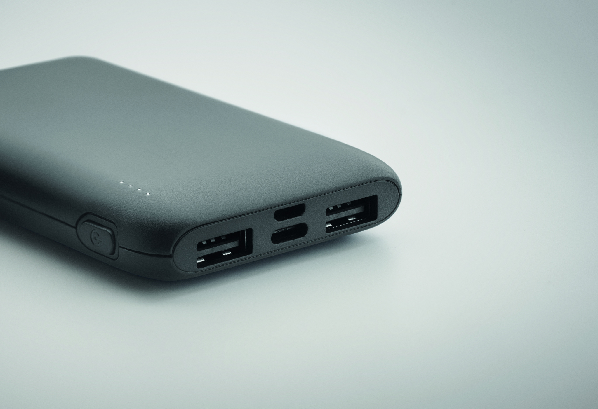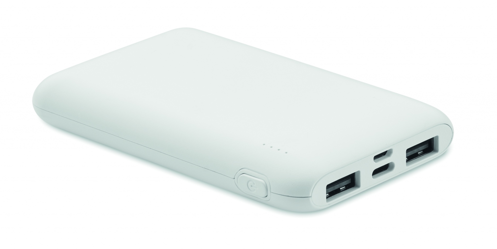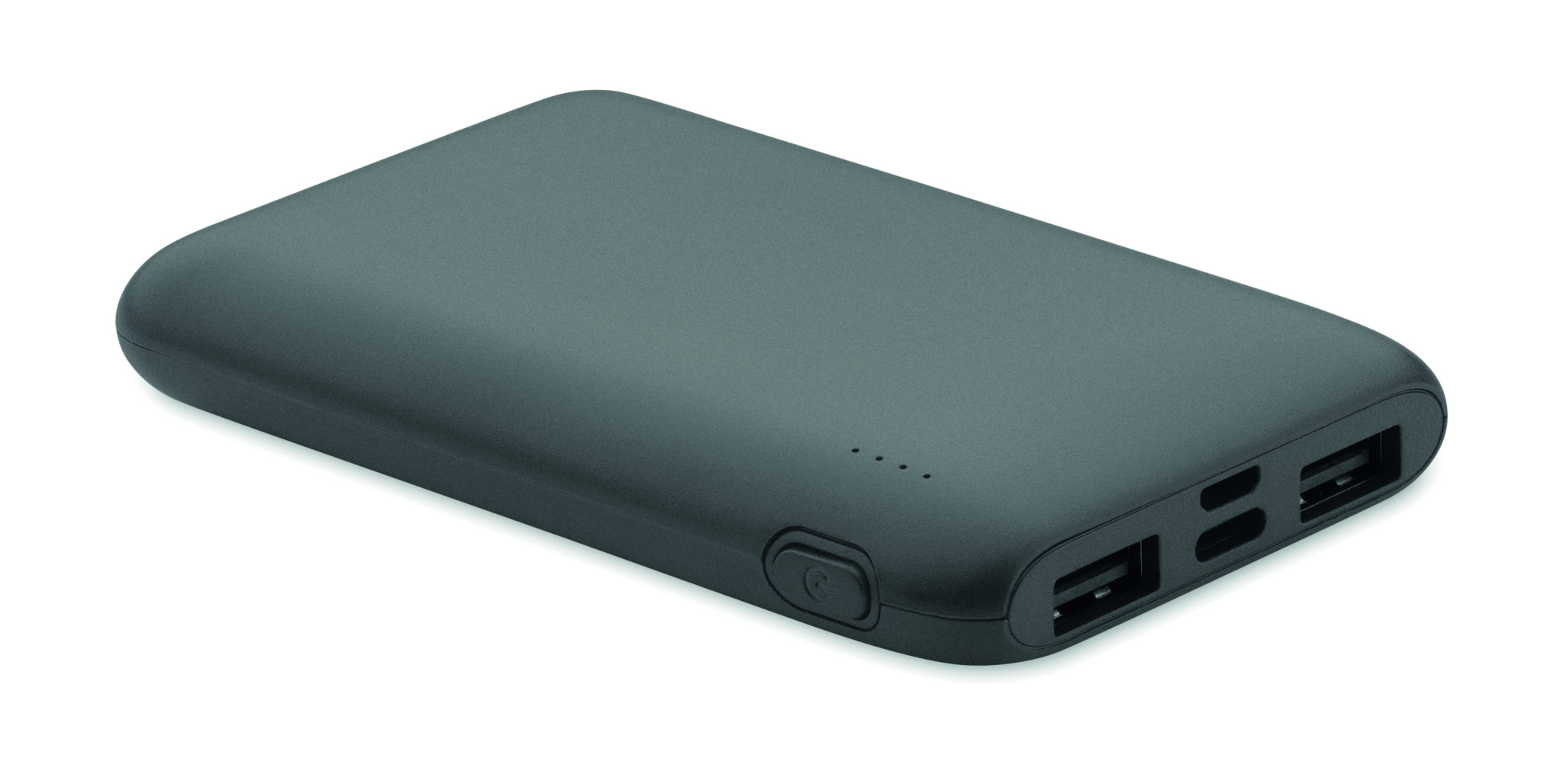 Varavirtalähde 5000 mAh kierrätetystä ABS-materiaalista. Kapasiteetti älypuhelinkäyttöön, Lähtö: 1 x Type-C, 2 x Type-A & 1 x Type-B. Tulo: 2-in-1 C-tyyppi & A-tyyppi.