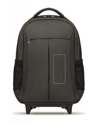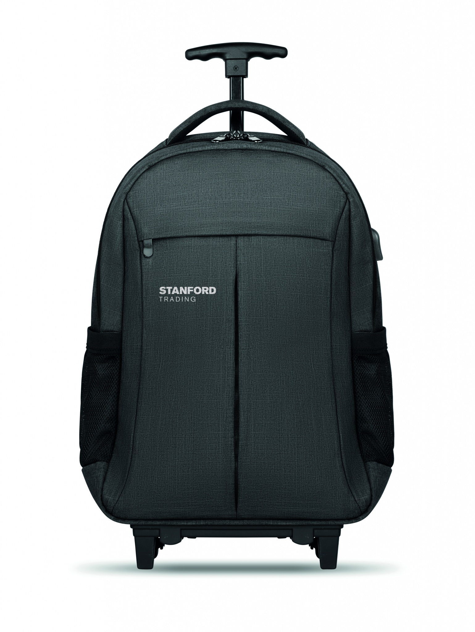 360D- polyesterinen vetolaukkureppu, sisältää 15 tuuman kannettavan tietokoneen lokeron, vetoketjutaskun edessä ja tabletille oman lokeron. Pehmustetut selkä- ja olkahihnat, sisäänrakennettu hiha suojaa pyöriä kannettaessa selässä.