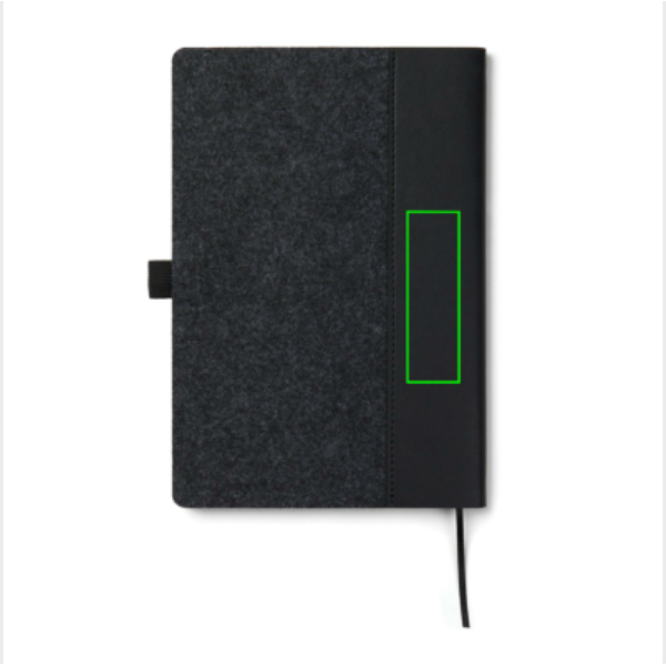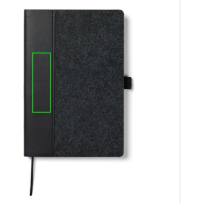 Kierrätyshuovasta tyylikkäästi valmistettu A5-muistikirja, jossa on meleerattu ilme ja integroitu kynäpidike. Se sisältää 80 arkkia tai 160 sivua 70 g/m² kierrätyspaperia, ja sen viivoitetut sivut sopivat erinomaisesti kaikenlaisiin muistiinpanoihin. GRS (Global Recycled Standard) -sertifiointi takaa, että kierrätysmateriaalien koko toimitusketju on sertifioitu. Kierrätysmateriaalin kokonaismäärä perustuu tuotteen kokonaispainoon. 83 % tästä tuotteesta on GRS-sertifioitua kierrätyspaperia ja 7 % GRS-sertifioitua kierrätyshuopaa.