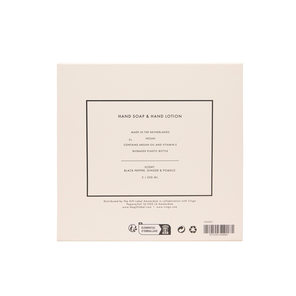 Sileät ja pehmeät kädet – joka päivä. Hemmottele käsiäsi tällä kauniisti tuoksuvalla setillä, joka sisältää kaksi 200 ml pulloa: käsisaippuan ja käsivoiteen. Lämmin ja raikas mustapippurin, inkiväärin ja pomelon tuoksu jättää kädet pehmeiksi, ravituiksi ja kevyesti tuoksuviksi – kosketuksen, joka jää mieleen. Tyylikkäästi pakattu kermanvalkoiseen ja mustaan lahjarasiaan.