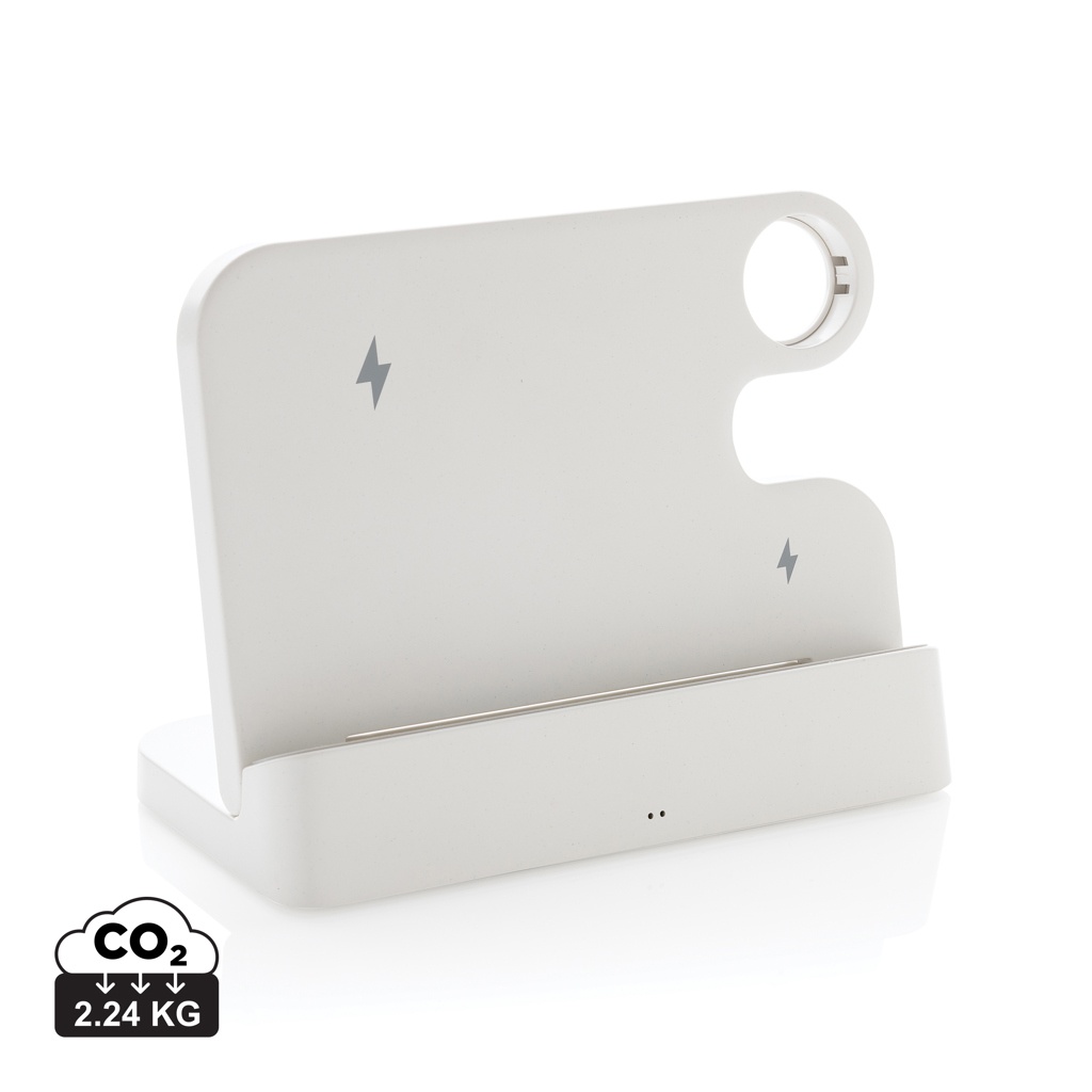 Sulankstomas dizaino įkrovimo stovas su 15 W belaidžiu įkrovikliu, pagamintu iš perdirbto ABS. Su antruoju 5 W belaidžiu įkrovikliu mažesniems objektams, pvz., ausinėms, įkrauti. Su iWatch lizdu, kad tilptų oficialus iWatch įkrovimo laidas. Galinėje pusėje yra 5V/1A USB A ir USB C išvesties prievadas daiktams įkrauti laidu. Su silikoniniais antgaliais apačioje, kad neslystų, ir silikonine amortizacija prie stovo, kad telefonas būtų puikios būklės. Bendras perdirbtas turinys: 80% nuo bendro prekės svorio. RCS sertifikatas užtikrina visiškai sertifikuotą perdirbtų medžiagų tiekimo grandinę. Supakuota į FSC® pakuotę. Be PVC. Įskaitant RCS perdirbtą TPE 120 cm USB A į USB C įkrovimo laidą. Supakuota į FSC® pakuotę. Be PVC