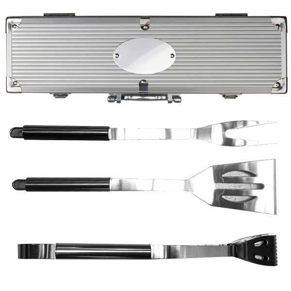 Grilio dėklas, kurį sudaro kepsninės žnyplės, mėsos šakutė ir kepsninės suktuvas metaliniame dėkle. Lazeriu uždedame Jūsų logotipą ant ovalios metalinės korpuso plokštės.