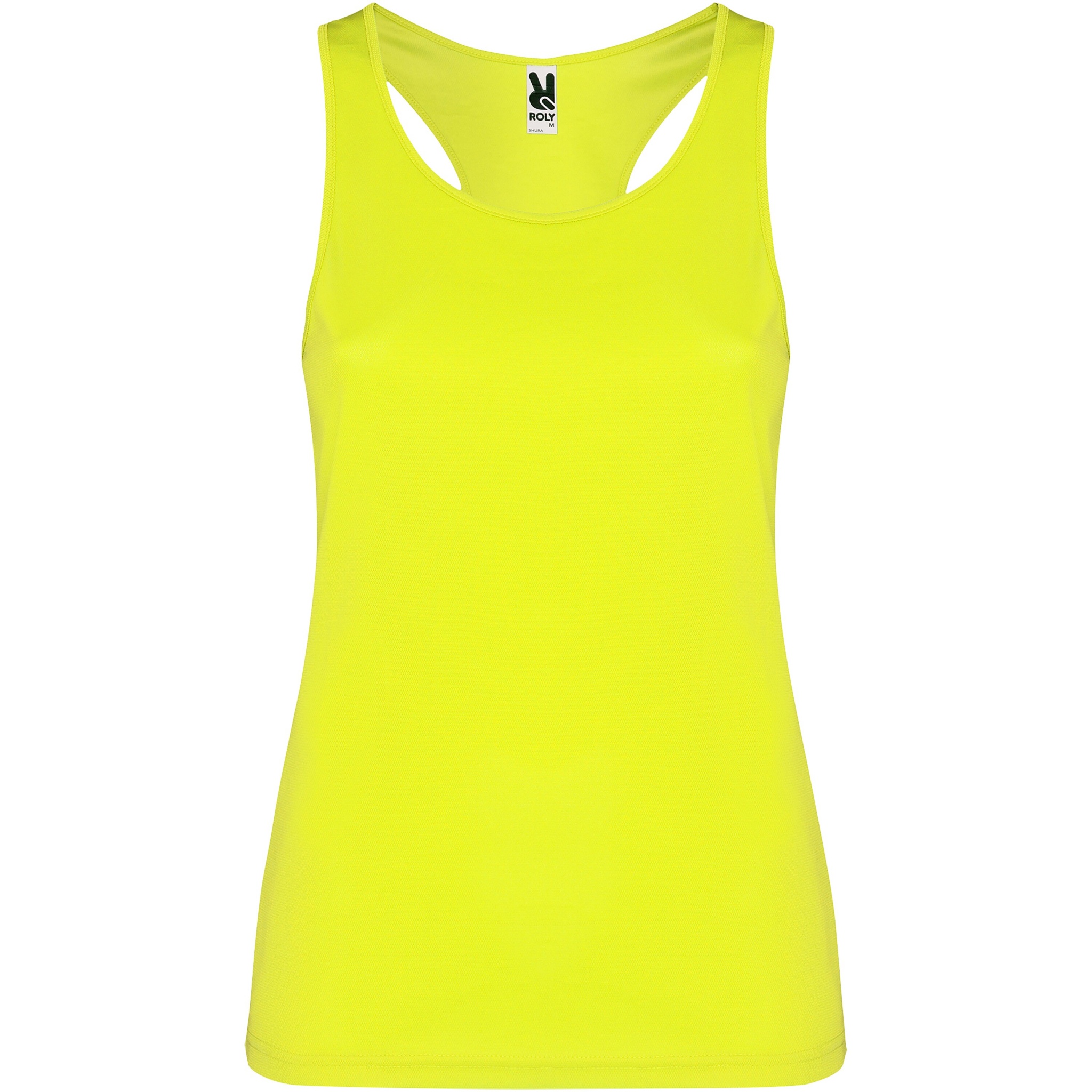 Techninis, kvėpuojantis, lengvai skalbiamas ir lengvai džiūstantis audinys. Ribuotos rankų angos ir iškirptė. Racerback ir šoninės siūlės. Nuimama etiketė.