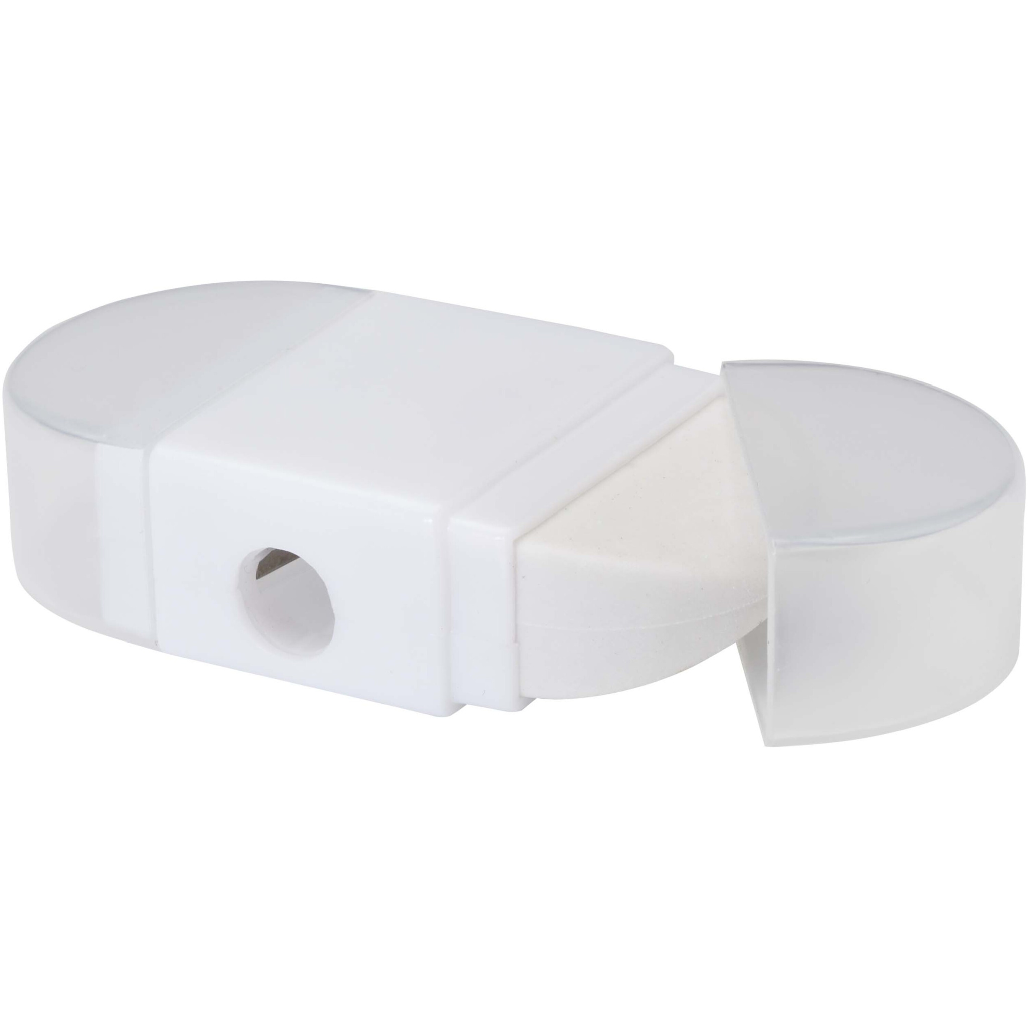 Pieštukų drožtukas su trintuku su skaidriais dangteliais iš abiejų pusių. Dydis: 6,2 x 3,3 x 1,6 cm.