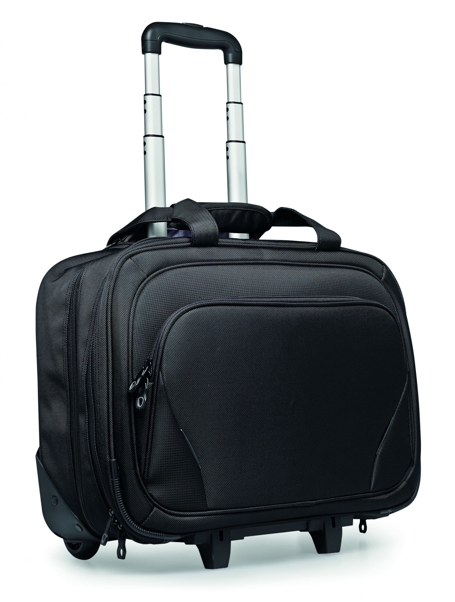 Verslo vežimėlis, kuriame yra 17 colių nešiojamojo kompiuterio kišenė ir 10 colių planšetinio kompiuterio kišenė su keliais skyriais. 1680D poliesteris.